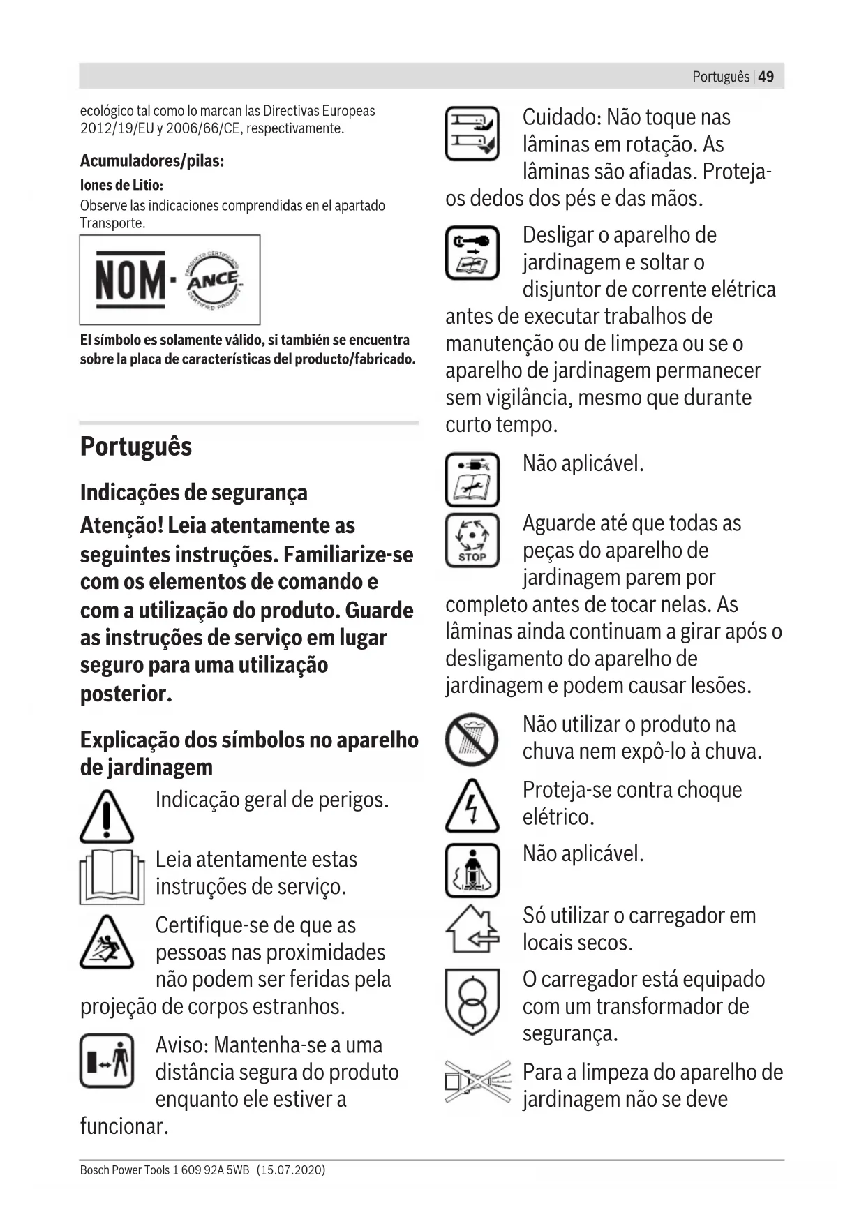 Acessórios apresentados ou descritos não pertencem ao volume de fornecimento padrão. Todos os acessórios encontram-se no nosso programa de acessórios. Colocação em funcionamento Para sua segurança u Atenção! Desligar o aparelho de jardinagem, soltar o disjuntor de corrente elétrica e remover o acumulador antes de executar trabalhos de manutenção e de limpeza. O mesmo vale, se o cabo de contacto estiver danificado, cortado ou emaranhado. u Depois de desligar o aparelho de jardinagem, as lâminas ainda giram durante alguns segundos. u Cuidado: Não tocar nas lâminas de corte em rotação. Carregar o acumulador O acumulador está equipado com um monitoramento de temperatura que só permite o carregamento na faixa de temperatura entre 0 °C e 35 °C. Assim é alcançada uma alta vida útil do acumulador. Nota: O acumulador é fornecido parcialmente carregado. Para assegurar a completa potência do acumulador, o acumulador deverá ser completamente carregado no carregador antes da primeira utilização. O acumulador de iões de lítio pode ser carregado a qualquer momento, sem que a vida útil seja reduzida. Uma interrupção do processo de carregamento não prejudica o acumulador. O acumulador de iões de lítio está protegida contra descarregamento profundo pela "Electronic Cell Protection (ECP)". Quando o acumulador está descarregado, o produto é desligado por um circuito de proteção: O aparelho de jardinagem não trabalha mais. Não se deve continuar a premir o botão liga-desliga depois de o produto ter sido desligado automaticamente. O acumulador pode ser danificado. Observe a indicação relativa à eliminação dos acumuladores. Introduzir/retirar o acumulador Nota: Se não forem utilizados acumuladores apropriados, podem ocorrer mau funcionamento ou danos no aparelho. Inserir o acumulador carregado. Certificar-se de que o acumulador está totalmente inserido. Para remover o acumulador do aparelho, se deve premir o botão de destravamento do acumulador e puxar o acumulador para fora. Processo de carregamento O processo de carregamento é iniciado assim que a ficha de rede do carregador for introduzida na tomada e o acumulador for inserido no carregador . Graças ao processo de carregamento inteligente, o estado da carga do acumulador é detectado automaticamente e a corrente de carga ideal é selecionada dependendo da temperatura e da tensão do acumulador. Desta forma o acumulador é poupado e permanece completamente carregado, mesmo durante o armazenamento no carregador. Bosch Power Tools 1 609 92A 5WB | (15.07.2020)58 | Português Significado dos elementos de indicação no carregador (AL 3620 CV/AL 3640 CV/AL 36V-20) Processo de carga rápido O processo de carregamento rápido é sinalizado pelo piscar rápido da indicação verde da carga do acumulador. Elemento de indicação no acumulador: Os três LEDs verdes iluminam-se sequencialmente e apagam-se por instantes durante o processo de carga. O acumulador está completamente carregado, se os três LEDs verdes permanecerem iluminados. Aprox. 5minutos depois do acumulador estar completamente carregado, apagam-se novamente os três LEDs verdes. Nota: O carregamento rápido só é possível se a temperatura do acumulador estiver dentro da faixa de temperatura de carregamento permitida, vide capítulo "Dados técnicos". Bateria carregada A luz permanente do LED verde sinaliza que o acumulador está completamente carregado. Adicionalmente soa durante aprox. 2 segundos um sinal acústico, que sinaliza o carregamento completo do acumulador. Em seguida o acumulador pode ser colocado imediatamente em funcionamento. Sem que o acumulador esteja inserido, a luz permanente da indicação LED indica que a ficha de rede está inserida na tomada e que o carregador está pronto para ser utilizado. Temperatura do acumulador abaixo de 0°C ou acima de 45°C A luz permanente da indicação LED vermelha sinaliza que a temperatura do acumulador está fora da faixa admissível da temperatura de carregamento, vide „Dados técnicos“. Assim que a faixa de temperatura admissível for alcançada, o carregador comutar‑se‑á automaticamente para o carregamento rápido. Se a temperatura do acumulador estiver fora da faixa de temperatura de carga admissível, o LED vermelho do acumulador iluminar-se-á assim que o acumulador for introduzido no carregador. Nenhum processo de carga possível Se houver uma outra falha no processo de carga, esta será sinalizada pelo piscar da indicação LED vermelha. O processo de carga não pode ser iniciado e não é possível carregar o acumulador (veja capítulo “Busca de erros”). Indicações para carregar No caso de contínuos e repetidos ciclos de carga, sem interrupção, é possível que o carregador se esquente. Isto no entanto não tem importância e não apresenta qualquer defeito técnico do carregador. Um período de funcionamento reduzido após o carregamento, indica que o acumulador está gasto e que deve ser substituído. Observar a indicação sobre a eliminação de forma ecológica. Arrefecimento do acumulador (ative Air Cooling) O comando de ventilação integrado no carregador monitoriza a temperatura da bateria utilizada. Se a temperatura do acumulador estiver acima de 30 °C, o acumulador será arrefecido por um ventilador até alcançar a temperatura ideal de carga. O ventilador ligado origina um ruído de ventilação. Se o ventilador não estiver a funcionar, é porque a temperatura da bateria se encontra na faixa de temperatura de carga ideal ou o ventilador tem defeito. Neste caso o período de carga do acumulador é prolongado. Indicações de trabalho Indicação da carga do acumulador O acumulador está equipado com uma indicação do estado de carga, que indica o estado de carga do acumulador. A indicação do estado de carga consiste de 3 LEDs verdes. Acionar a tecla para a indicação do estado de carga para ativar a indicação do estado de carga. A indicação do