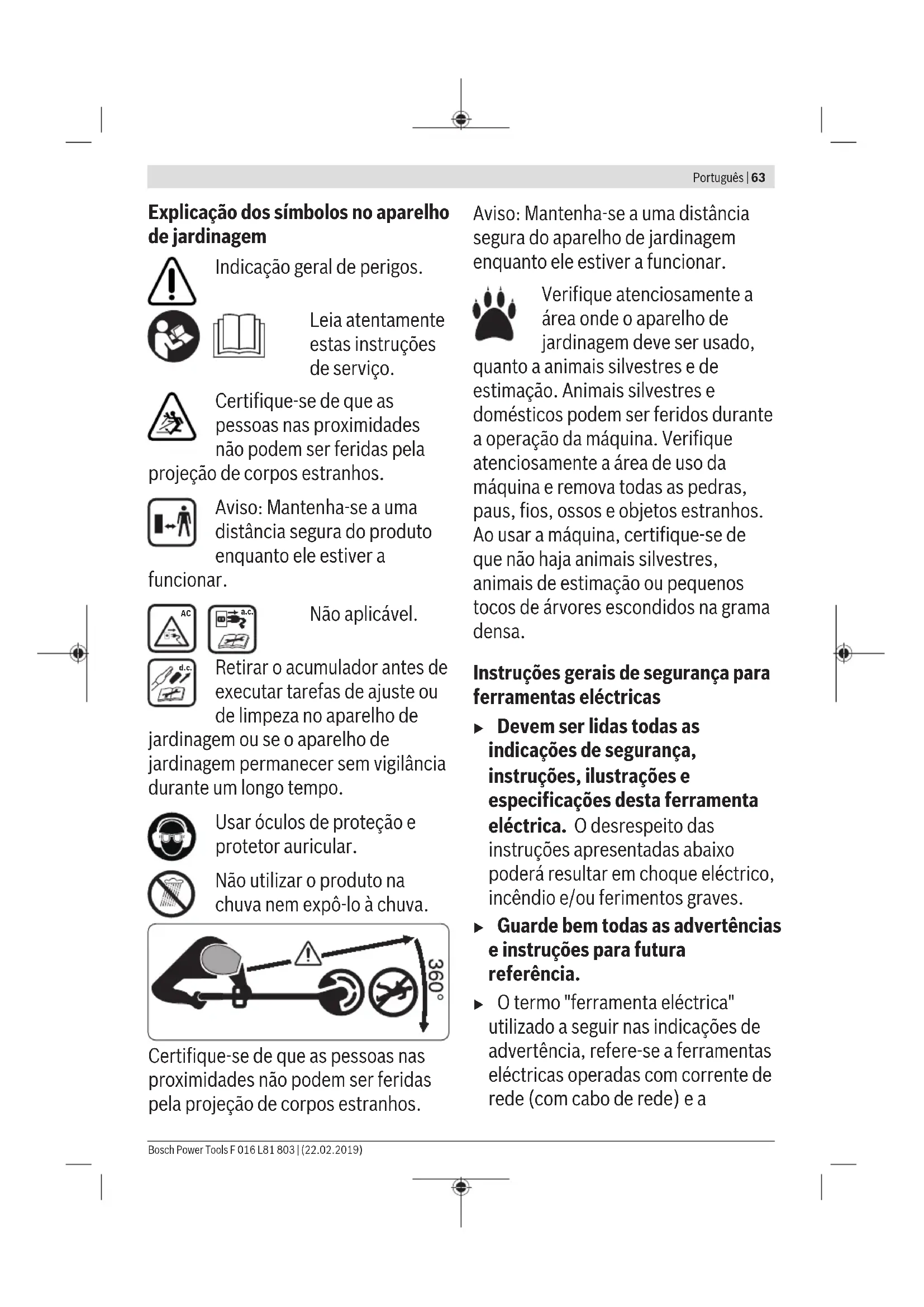 a.c. Não aplicável. d.c. Retirar o acumulador antes de executar tarefas de ajuste ou de limpeza no aparelho de jardinagem ou se o aparelho de jardinagem permanecer sem vigilância durante um longo tempo. Usar óculos de proteção e protetor auricular. Não utilizar o produto na chuva nem expô-lo à chuva. Certifique-se de que as pessoas nas proximidades não podem ser feridas pela projeção de corpos estranhos. Aviso: Mantenha-se a uma distância segura do aparelho de jardinagem enquanto ele estiver a funcionar. Verifique atenciosamente a área onde o aparelho de jardinagem deve ser usado, quanto a animais silvestres e de estimação. Animais silvestres e domésticos podem ser feridos durante a operação da máquina. Verifique atenciosamente a área de uso da máquina e remova todas as pedras, paus, fios, ossos e objetos estranhos. Ao usar a máquina, certifique-se de que não haja animais silvestres, animais de estimação ou pequenos tocos de árvores escondidos na grama densa. Instruções gerais de segurança para ferramentas eléctricas u Devem ser lidas todas as indicações de segurança, instruções, ilustrações e especificações desta ferramenta eléctrica. O desrespeito das instruções apresentadas abaixo poderá resultar em choque eléctrico, incêndio e/ou ferimentos graves. u Guarde bem todas as advertências e instruções para futura referência. u O termo "ferramenta eléctrica" utilizado a seguir nas indicações de advertência, refere‑se a ferramentas eléctricas operadas com corrente de rede (com cabo de rede) e a Bosch Power Tools F 016 L81 803 | (22.02.2019)64 | Português ferramentas eléctricas operadas com acumulador (sem cabo de rede). Segurança da área de trabalho u Mantenha a sua área de trabalho sempre limpa e bem iluminada. Desordem ou áreas de trabalho insuficientemente iluminadas podem levar a acidentes. u Não trabalhar com a ferramenta eléctrica em áreas com risco de explosão, nas quais se encontrem líquidos, gases ou pós inflamáveis. Ferramentas eléctricas produzem faíscas, que podem inflamar pós ou vapores. u Manter crianças e outras pessoas afastadas da ferramenta eléctrica durante a utilização. No caso de distracção é possível que perca o controlo sobre o aparelho. Segurança eléctrica u A ficha de conexão da ferramenta eléctrica deve caber na tomada. A ficha não deve ser modificada de maneira alguma. Não utilizar uma ficha de adaptação junto com ferramentas eléctricas protegidas por ligação à terra. Fichas não modificadas e tomadas apropriadas reduzem o risco de um choque eléctrico. u Evitar que o corpo possa entrar em contacto com superfícies ligadas à terra, como tubos, aquecimentos, fogões e frigoríficos. Há um risco elevado devido a choque eléctrico, se o corpo estiver ligado à terra. u Manter o aparelho afastado de chuva ou humidade. A infiltração de água numa ferramenta eléctrica aumenta o risco de choque eléctrico. u Não deverá utilizar o cabo para outras finalidades. Nunca utilizar o cabo para transportar a ferramenta eléctrica, para pendurá‑la, nem para puxar a ficha da tomada. Manter o cabo afastado do calor, do óleo, de arestas afiadas ou de peças em movimento. Cabos danificados ou emaranhados aumentam o risco de um choque eléctrico. u Se trabalhar com uma ferramenta eléctrica ao ar livre, só deverá utilizar cabos de extensão apropriados para áreas exteriores. A utilização de um cabo de extensão apropriado para áreas exteriores reduz o risco de um choque eléctrico. u Se não for possível evitar o funcionamento da ferramenta eléctrica em áreas húmidas, deverá ser utilizado um disjuntor de corrente de avaria. A utilização de um disjuntor de corrente de avaria reduz o risco de um choque eléctrico. F 016 L81 803 | (22.02.2019) Bosch Power ToolsPortuguês | 65 Segurança de pessoas u Esteja atento, observe o que está a fazer e tenha prudência ao trabalhar com a ferramenta eléctrica. Não utilizar uma ferramenta eléctrica quando estiver fatigado ou sob a influência de drogas, álcool ou medicamentos. Um momento de descuido ao utilizar a ferramenta eléctrica, pode levar a lesões graves. u Utilizar equipamento de protecção individual. Utilizar sempre óculos de protecção. A utilização de equipamento de protecção pessoal, como máscara de protecção contra pó, sapatos de segurança antiderrapantes, capacete de segurança ou protecção auricular, de acordo com o tipo e aplicação da ferramenta eléctrica, reduz o risco de lesões. u Evitar uma colocação em funcionamento involuntária. Assegure‑se de que a ferramenta eléctrica esteja desligada, antes de conectá‑la à alimentação de rede e/ou ao acumulador, antes de levantá‑la ou de transportá‑la. Se tiver o dedo no interruptor ao transportar a ferramenta eléctrica ou se o aparelho for conectado à alimentação de rede enquanto estiver ligado, poderão ocorrer acidentes. u Remover ferramentas de ajuste ou chaves de boca antes de ligar a ferramenta eléctrica. Uma ferramenta ou chave que se encontre numa parte do aparelho em movimento pode levar a lesões. u Evite uma posição anormal. Mantenha uma posição firme e mantenha sempre o equilíbrio. Desta forma é mais fácil controlar a ferramenta eléctrica em situações inesperadas. u Usar roupa apropriada. Não usar roupa larga nem jóias. Mantenha os cabelos e roupas afastados de peças em movimento. Roupas frouxas, cabelos longos ou jóias podem ser agarrados por peças em movimento. u Se for possível montar dispositivos de aspiração ou de recolha, assegure‑se de que estejam conectados e utilizados correctamente. A utilização de uma aspiração de pó pode reduzir o perigo devido ao pó. u Não deixe que a familiaridade resultante de uma utilização frequente de ferramentas permita que você se torne complacente e ignore os princípios de segurança da ferramenta. Uma acção descuidada pode causar ferimentos graves n