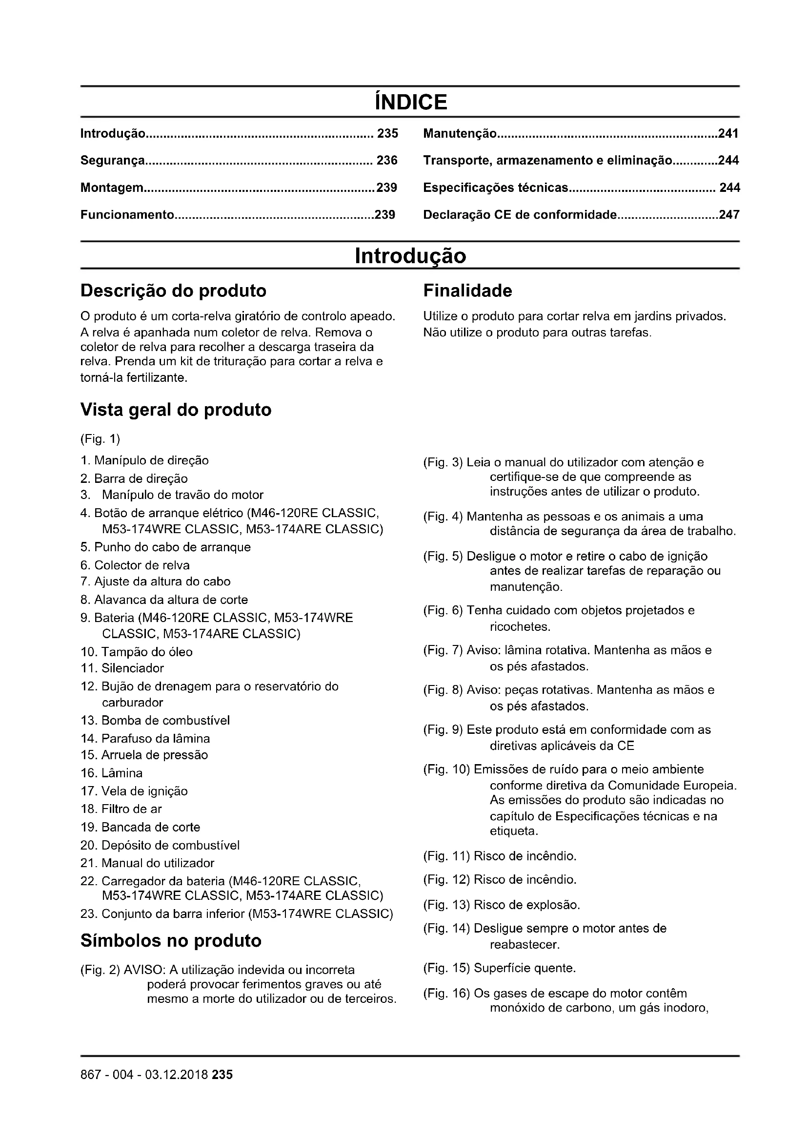 - Declaração CE de conformidade Introdução Descrição do produto O produto é um corta-relva giratório de controlo apeado. A relva é apanhada num coletor de relva. Remova o coletor de relva para recolher a descarga traseira da relva. Prenda um kit de trituração para cortar a relva e torná-la fertilizante. Finalidade Utilize o produto para cortar relva em jardins privados. Não utilize o produto para outras tarefas. Vista geral do produto (Fig. 1) p. 247