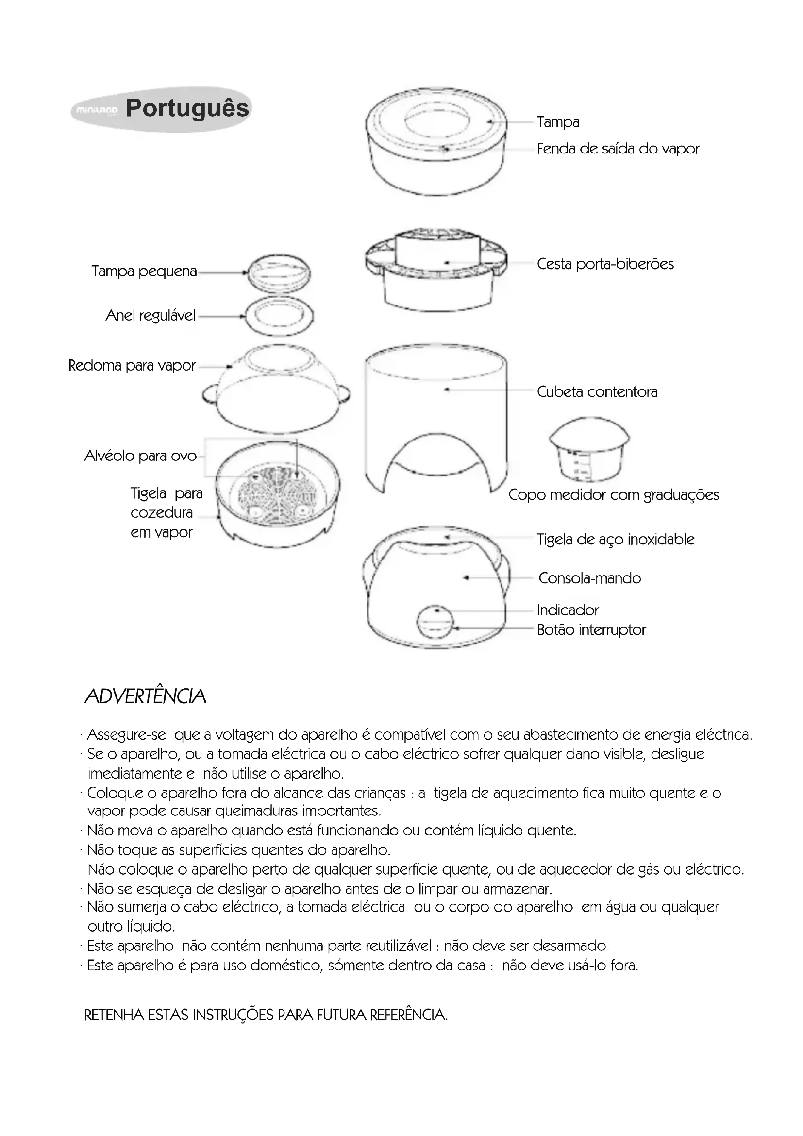 - Pode limpar a cubeta, a tampa e a cesta porta-biberões em água quente com sabão ou na máquina lava-louça. Resíduos minerais, particularmente em regiões de águas muito calcárias, podem depositar-se na tigela de aquecimento depois de alguns ciclos de esterilização. Para evitar a formação de camada calcária, enxugue as superfícies do aparelho com farrapo macio húmido depois de cada operação. Pode descalcificar com produto anticalcário ou mistura (30ml) de água e vinagre (1 parte de vinagre e 4 partes de água) na tigela de aquecimento durante aproximativamente 30 minutos ; esvaziar e enxugar cuidadosamente com farrapo limpo e seco. Algumas manchas de descoloração podem permanecer depois de limpar com solução de vinagre: não é importante. Não use abrasivos ou solventes para limpar : podem danificar o aparelho e a superfície da tigela de aquecimento. Características técnicas: Tensão : 230VAC 50/60Hz Potência em watts : 300W ADVERTÊNCIA : Este aparelho deve ser ligado à terra.Petit couvercle réglableBague Cloche à vapeur Alvéoles pour oeufs Bol pour cuisson vapeur Couvercle fente de sortie de la vapeur Panier porte-biberons Cuve Verre mesureur gradué Bol en acier inoxydable Console-commande Témoin lumineux Interrupteur marche/arrêt