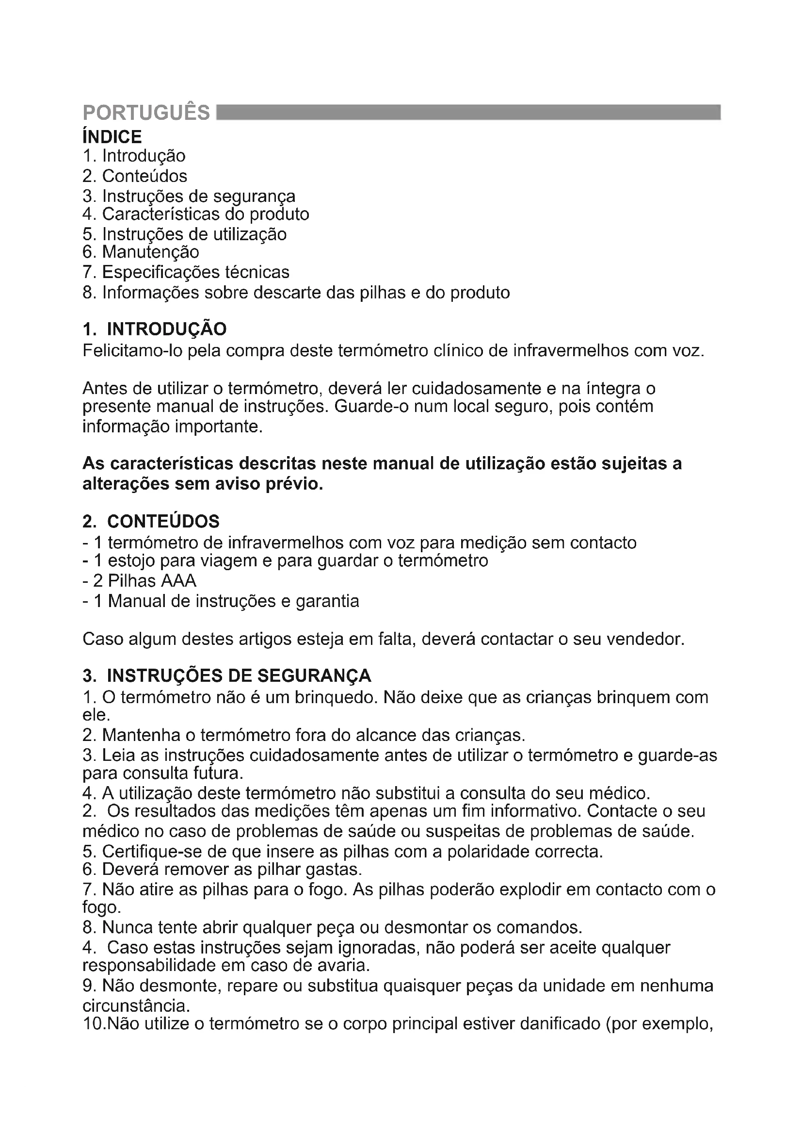 Felicitamo-lo pela compra deste termómetro clínico de infravermelhos com voz. Antes de utilizar o termómetro, deverá ler cuidadosamente e na íntegra o presente manual de instruções. Guarde-o num local seguro, pois contém informação importante. As características descritas neste manual de utilização estão sujeitas a alterações sem aviso prévio.