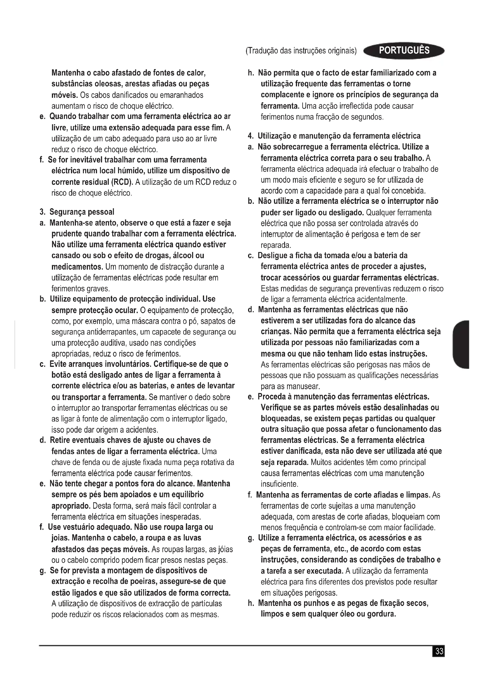 a. As chas da ferramenta eléctrica devem encaixar na tomada. Nunca modique a cha de forma alguma. Não utilize chas adaptadoras com ferramentas eléctricas ligadas à terra. As chas não modicadas e as tomadas compatíveis reduzem o risco de choque eléctrico. b. Evite que o corpo entre em contacto com superfícies ligadas à terra, como tubos, radiadores, fogões e frigorícos. Se o seu corpo estiver “ligado” à terra, o risco de choque eléctrico é maior. c. As ferramentas eléctricas não podem ser expostas a chuva nem humidade. A entrada de água numa ferramenta eléctrica aumenta o risco de choque eléctrico. d. Manuseie o cabo com cuidado. Nunca o utilize para transportar, puxar ou desligar a ferramenta eléctrica.33 (Tradução das instruções originais) PORTUGUÊS Mantenha o cabo afastado de fontes de calor, substâncias oleosas, arestas aadas ou peças móveis. Os cabos danicados ou emaranhados aumentam o risco de choque eléctrico. e. Quando trabalhar com uma ferramenta eléctrica ao ar livre, utilize uma extensão adequada para esse m. A utilização de um cabo adequado para uso ao ar livre reduz o risco de choque eléctrico. f. Se for inevitável trabalhar com uma ferramenta eléctrica num local húmido, utilize um dispositivo de corrente residual (RCD). A utilização de um RCD reduz o risco de choque eléctrico.