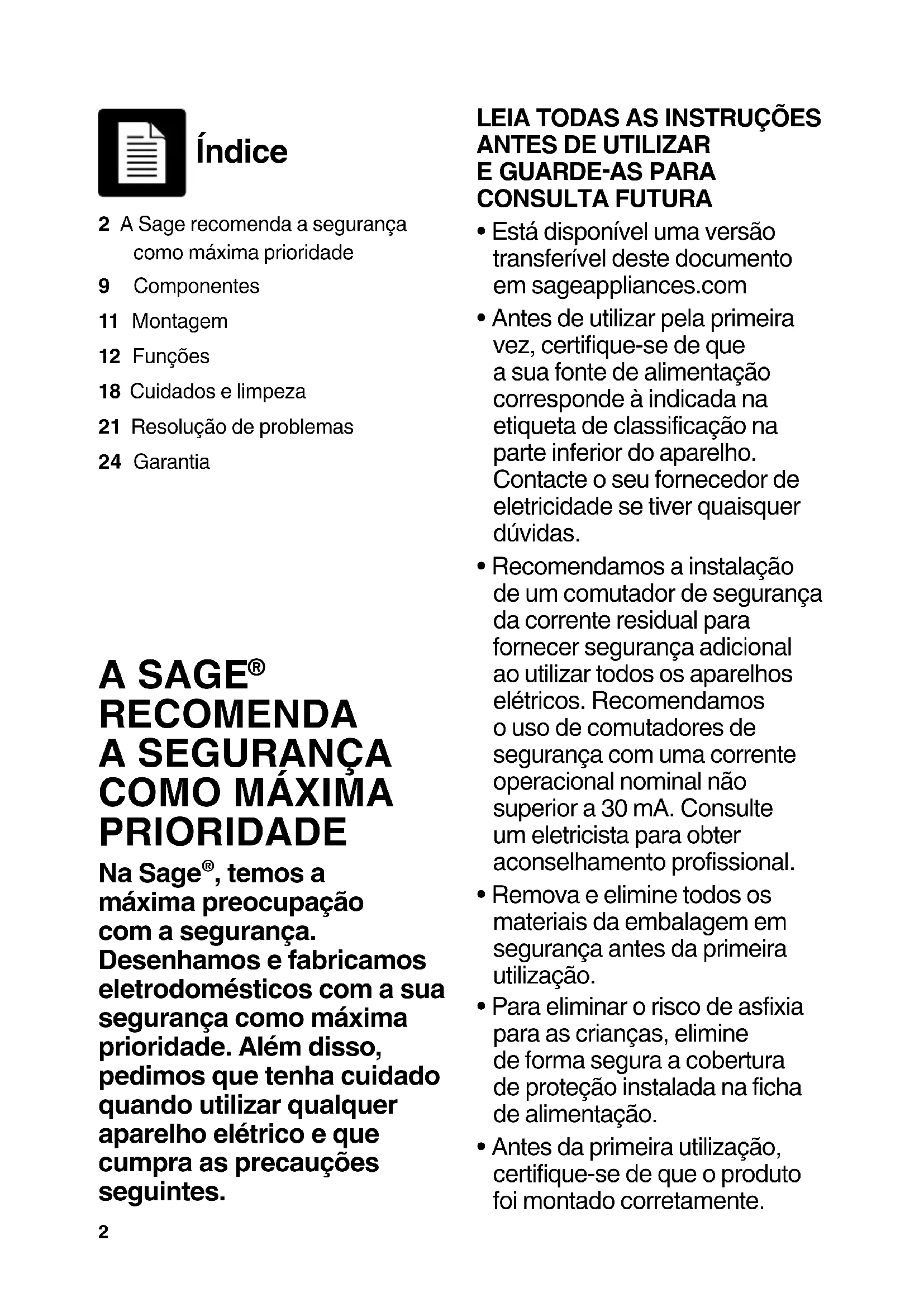 , temos a máxima preocupação com a segurança. Desenhamos e fabricamos eletrodomésticos com a sua segurança como máxima prioridade. Além disso, pedimos que tenha cuidado quando utilizar qualquer aparelho elétrico e que cumpra as precauções seguintes. Índice 2 A Sage recomenda a segurança como máxima prioridade9 Componentes11 Montagem12 Funções18 Cuidados e limpeza21 Resolução de problemas24 Garantia3