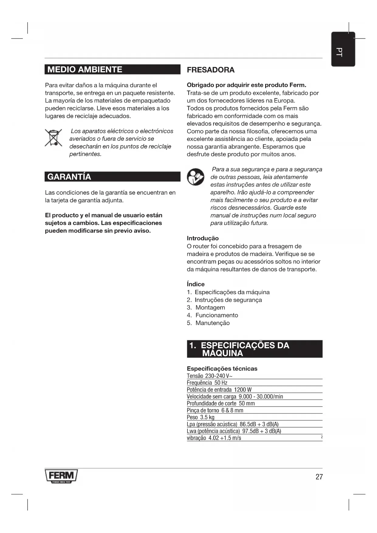 MEDIO AMBIENTE Para evitar daños a la máquina durante el transporte, se entrega en un paquete resistente. La mayoría de los materiales de empaquetado pueden reciclarse. Lleve esos materiales a los lugares de reciclaje adecuados. Los aparatos eléctricos o electrónicos averiados o fuera de servicio se desecharán en los puntos de reciclaje pertinentes. GARANTÍA Las condiciones de la garantía se encuentran en la tarjeta de garantía adjunta. El producto y el manual de usuario están sujetos a cambios. Las especificaciones pueden modificarse sin previo aviso. FRESADORA Obrigado por adquirir este produto Ferm. Trata-se de um produto excelente, fabricado por um dos fornecedores líderes na Europa. Todos os produtos fornecidos pela Ferm são fabricado em conformidade com os mais elevados requisitos de desempenho e segurança. Como parte da nossa filosofia, oferecemos uma excelente assistência ao cliente, apoiada pela nossa garantia abrangente. Esperamos que desfrute deste produto por muitos anos. Para a sua segurança e para a segurança de outras pessoas, leia atentamente estas instruções antes de utilizar este aparelho. Irão ajudá-lo a compreender mais facilmente o seu produto e a evitar riscos desnecessários. Guarde este manual de instruções num local seguro para utilização futura. Introdução O router foi concebido para a fresagem de madeira e produtos de madeira. Verifique se se encontram peças ou acessórios soltos no interior da máquina resultantes de danos de transporte. Índice