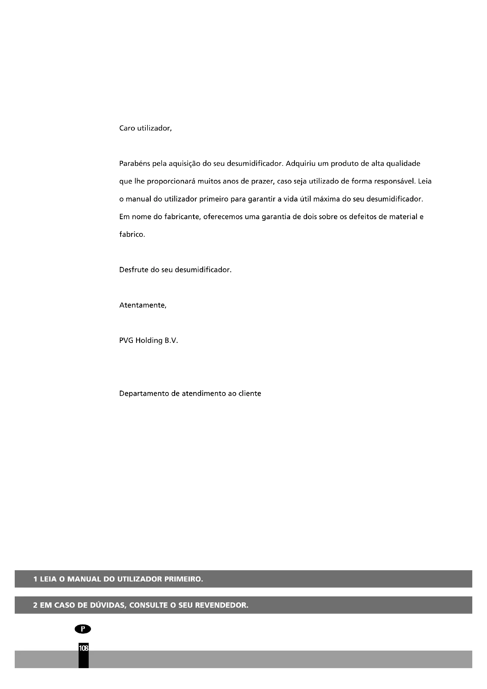Caro utilizador, Parabéns pela aquisição do seu desumidificador. Adquiriu um produto de alta qualidade que lhe proporcionará muitos anos de prazer, caso seja utilizado de forma responsável. Leia o manual do utilizador primeiro para garantir a vida útil máxima do seu desumidificador. Em nome do fabricante, oferecemos uma garantia de dois sobre os defeitos de material e fabrico. Desfrute do seu desumidificador. Atentamente, PVG Holding B.V. Departamento de atendimento ao cliente9