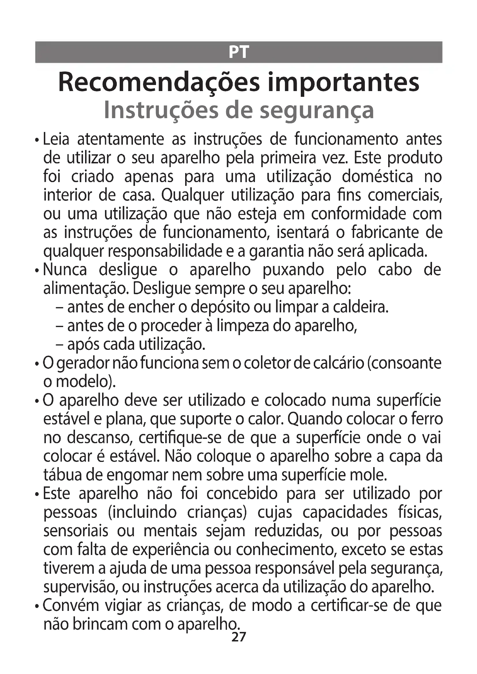 - Este aparelho pode ser utilizado por crianças com idade superior a 8 anos e pessoas sem experiência e conhecimento ou cujas capacidades físicas, sensoriais ou mentais sejam reduzidas, desde que tenham recebido formação relativamente à utilização do aparelho de uma forma segura e estão cientes dos riscos envolvidos. As crianças não devem brincar com o aparelho. As crianças não devem limpar nem fazer manutenção ao aparelho sem supervisão. Mantenha o ferro e o cabo de alimentação fora do alcance de crianças com menos de 8 anos de idade, quando o ferro estiver ligado à corrente ou estiver a arrefecer.