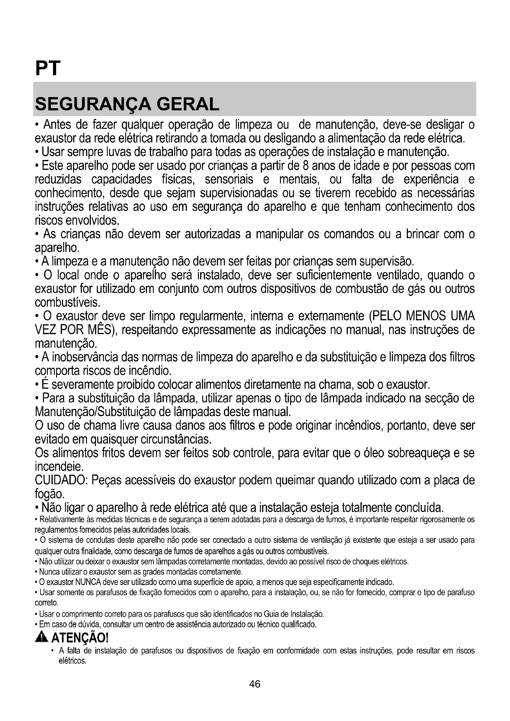 A voltagem da rede elétrica deve corresponder com a voltagem indicada na etiqueta das características, situada no interior do exaustor. Se dotado de ficha, conectar o exaustor a uma tomada, em conformidade com as normas vigentes, posta em zona acessível, mesmo depois da instalação. Se não tiver ficha (conexão direta à rede) ou a tomada não se encontrar numa zona acessível, mesmo depois da instalação, aplicar um interruptor bipolar, em conformidade com a norma que assegure a desconexão completa da rede nas condições da categoria de sobretensão III, de acordo com as regras de instalação. ATENÇÃO! Antes de conectar novamente o circuito do exaustor com a alimentação elétrica, verificar o seu funcionamento, e verificar se o cabo de rede está montado corretamente. Se o cabo não estiver equipado com uma ficha,ligue os cabos de acordo com a tabela seguinte: Tensão da rede elétrica e frequência Ligação de cabo Consultar o valor indicado na etiqueta de características no interior do exaustor. : amarelo/verde N : azul L : castanho Substituição do cabo de alimentação O exaustor está equipado com um cabo de alimentação especial; no caso do cabo ficar danificado, efetuar um pedido ao serviço de assistência técnica.48