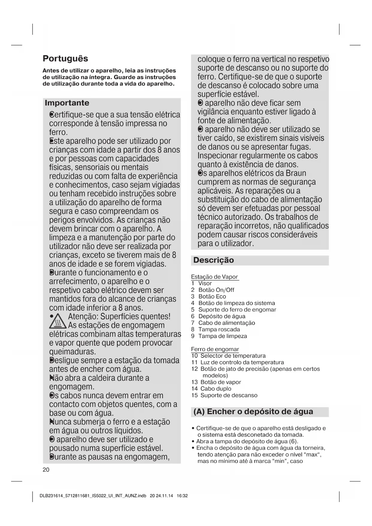 Os aparelhos elétricos da Braun cumprem as normas de segurança aplicáveis. As reparações ou a substituição do cabo de alimentação só devem ser efetuadas por pessoal técnico autorizado. Os trabalhos de reparação incorretos, não qualificados podem causar riscos consideráveis para o utilizador. Descrição Estação de Vapor 1 Visor 2 Botão On/Off 3 Botão Eco 4 Botão de limpeza do sistema 5 Suporte do ferro de engomar 6 Depósito de água 7 Cabo de alimentação 8 Tampa roscada 9 Tampa de limpeza Ferro de engomar 10 Selector de temperatura 11 Luz de controlo da temperatura 12 Botão de jato de precisão (apenas em certos modelos) 13 Botão de vapor 14 Cabo duplo 15 Suporte de descanso (A) Encher o depósito de água