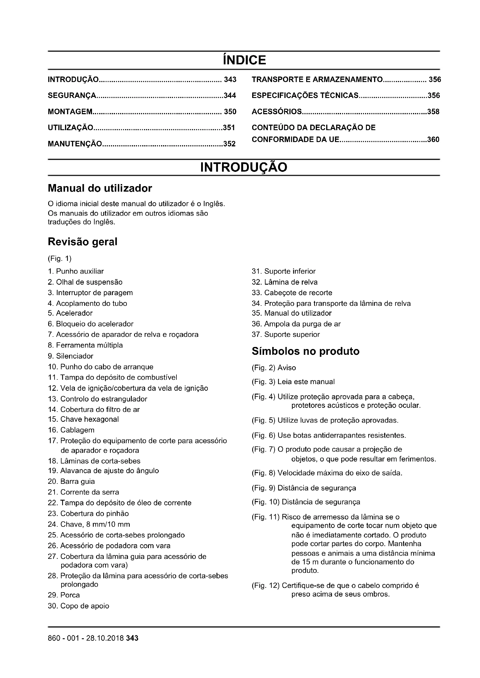 Símbolos no produto (Fig. 2) Aviso (Fig. 3) Leia este manual (Fig. 4) Utilize proteção aprovada para a cabeça, protetores acústicos e proteção ocular. (Fig. 5) Utilize luvas de proteção aprovadas. (Fig. 6) Use botas antiderrapantes resistentes. (Fig. 7) O produto pode causar a projeção de objetos, o que pode resultar em ferimentos. (Fig. 8) Velocidade máxima do eixo de saída. (Fig. 9) Distância de segurança (Fig. 10) Distância de segurança (Fig. 11) Risco de arremesso da lâmina se o equipamento de corte tocar num objeto que não é imediatamente cortado. O produto pode cortar partes do corpo. Mantenha pessoas e animais a uma distância mínima de 15 m durante o funcionamento do produto. (Fig. 12) Certifique-se de que o cabelo comprido é preso acima de seus ombros.