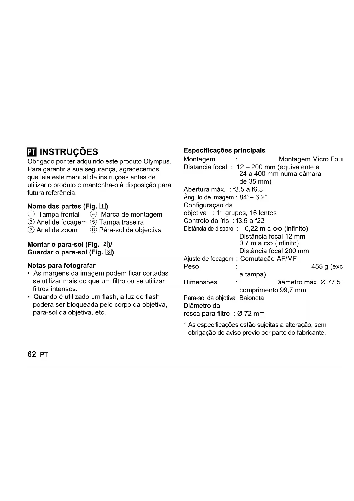 - Quando é utilizado um flash, a luz do flash poderá ser bloqueada pelo corpo da objetiva, para-sol da objetiva, etc. Especificações principais Montagem : Montagem Micro Four Thirds Distância focal : 12 – 200 mm (equivalente a 24 a 400 mm numa câmara de 35 mm) Abertura máx. : f3.5 a f6.3 Ângulo de imagem : 84°– 6,2° Configuração da objetiva : 11 grupos, 16 lentes Controlo da íris : f3.5 a f22 Distância de disparo : 0,22 m a ) (infinito) Distância focal 12 mm 0,7 m a ) (infinito) Distância focal 200 mm Ajuste de focagem : Comutação AF/MF Peso : 455 g (excluindo o para-sol e a tampa) Dimensões : Diâmetro máx. Ø 77,5 × comprimento 99,7 mm Para-sol da objetiva