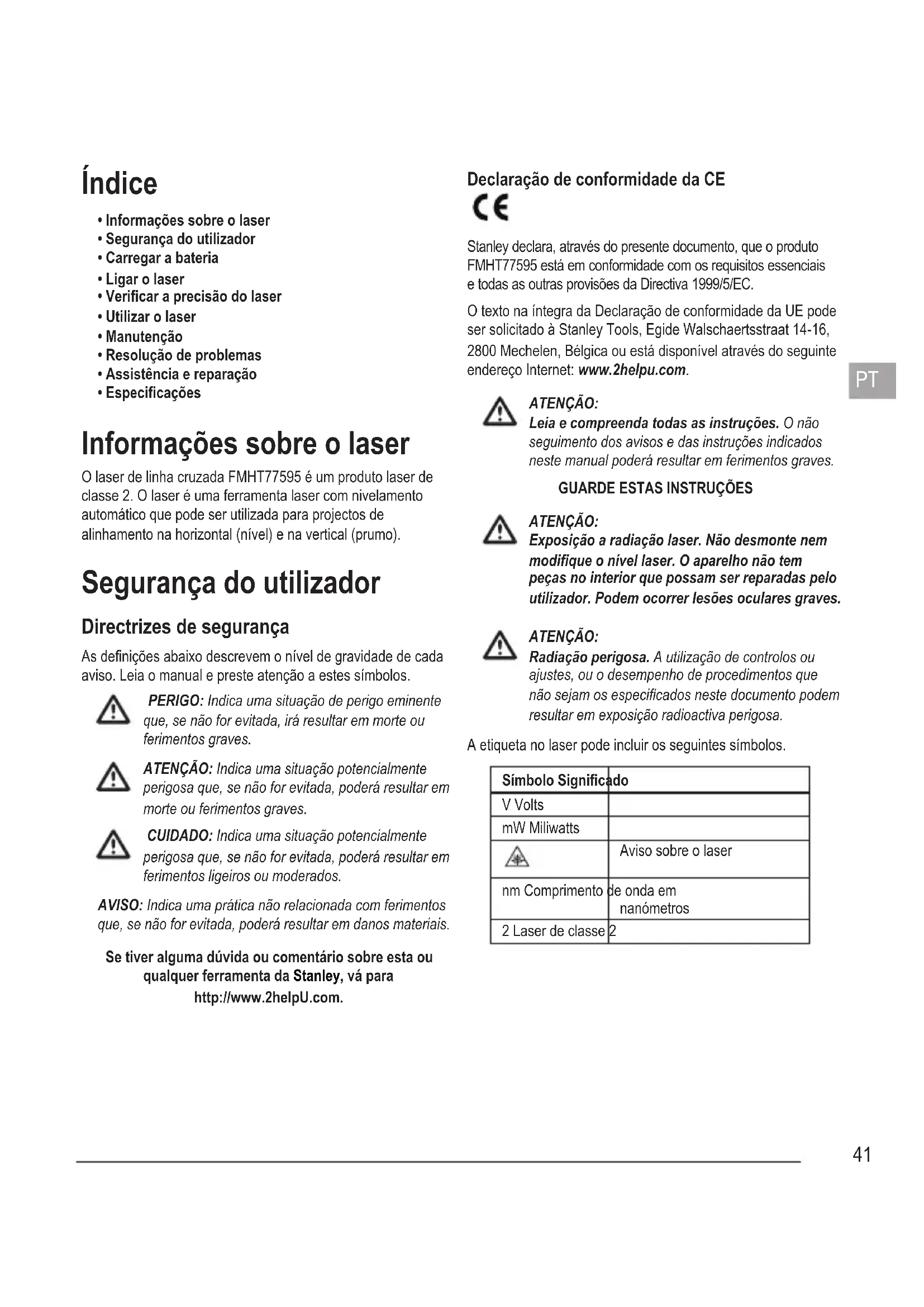 - Especicações Informações sobre o laser O laser de linha cruzada FMHT77595 é um produto laser de classe 2. O laser é uma ferramenta laser com nivelamento automático que pode ser utilizada para projectos de alinhamento na horizontal (nível) e na vertical (prumo). Segurança do utilizador Directrizes de segurança As denições abaixo descrevem o nível de gravidade de cada aviso. Leia o manual e preste atenção a estes símbolos. PERIGO: Indica uma situação de perigo eminente que, se não for evitada, irá resultar em morte ou ferimentos graves. ATENÇÃO: Indica uma situação potencialmente perigosa que, se não for evitada, poderá resultar em morte ou ferimentos graves. CUIDADO: Indica uma situação potencialmente perigosa que, se não for evitada, poderá resultar em ferimentos ligeiros ou moderados. AVISO: Indica uma prática não relacionada com ferimentos que, se não for evitada, poderá resultar em danos materiais. Se tiver alguma dúvida ou comentário sobre esta ou qualquer ferramenta da Stanley, vá para http://www.2helpU.com. Declaração de conformidade da CE Stanley declara, através do presente documento, que o produto FMHT77595 está em conformidade com os requisitos essenciais e todas as outras provisões da Directiva 1999/5/EC. O texto na íntegra da Declaração de conformidade da UE pode ser solicitado à Stanley Tools, Egide Walschaertsstraat 14-16, 2800 Mechelen, Bélgica ou está disponível através do seguinte endereço Internet: www.2helpu.com. ATENÇÃO: Leia e compreenda todas as instruções. O não seguimento dos avisos e das instruções indicados neste manual poderá resultar em ferimentos graves.
