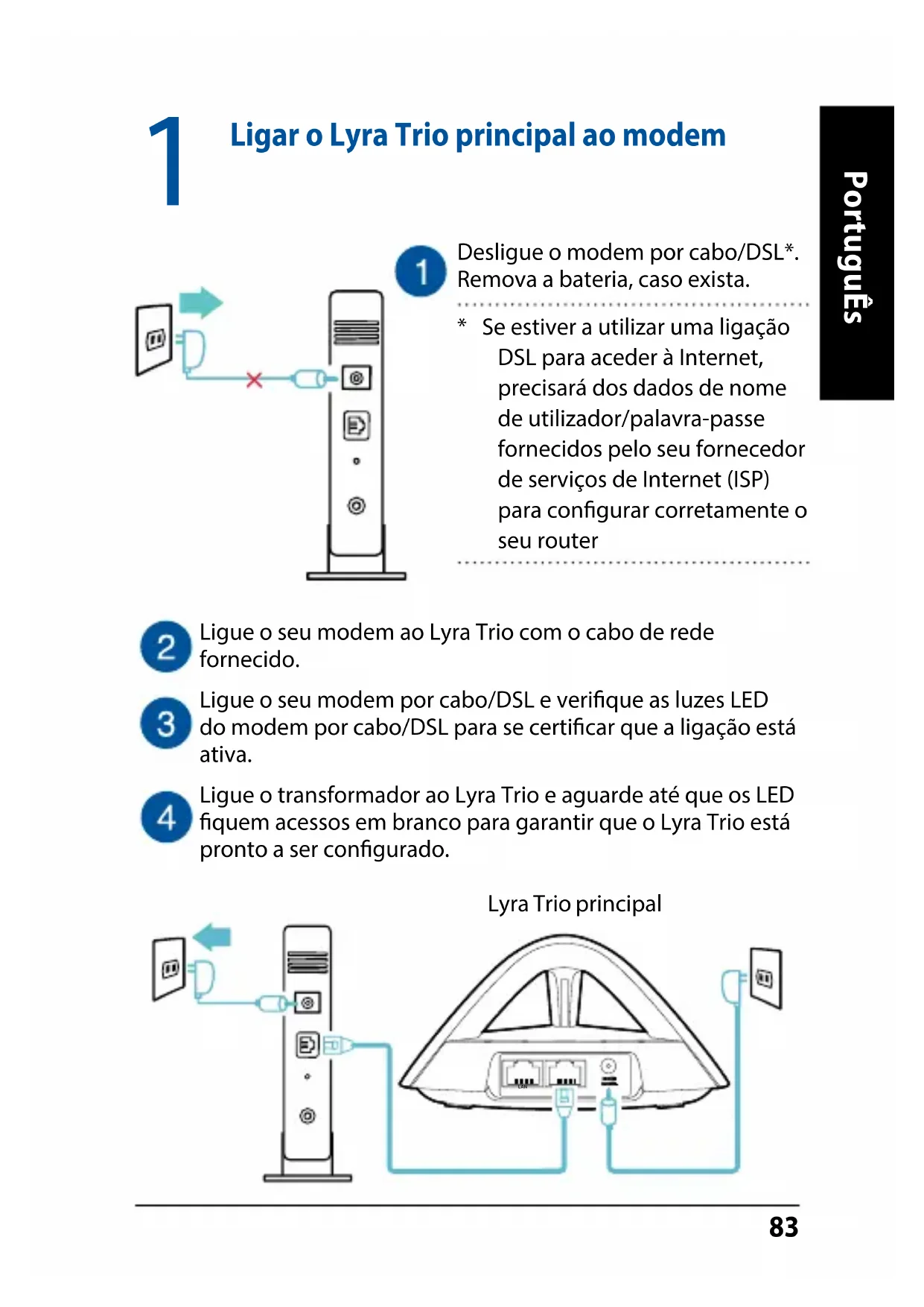 Ligue o seu modem ao Lyra Trio com o cabo de rede fornecido.