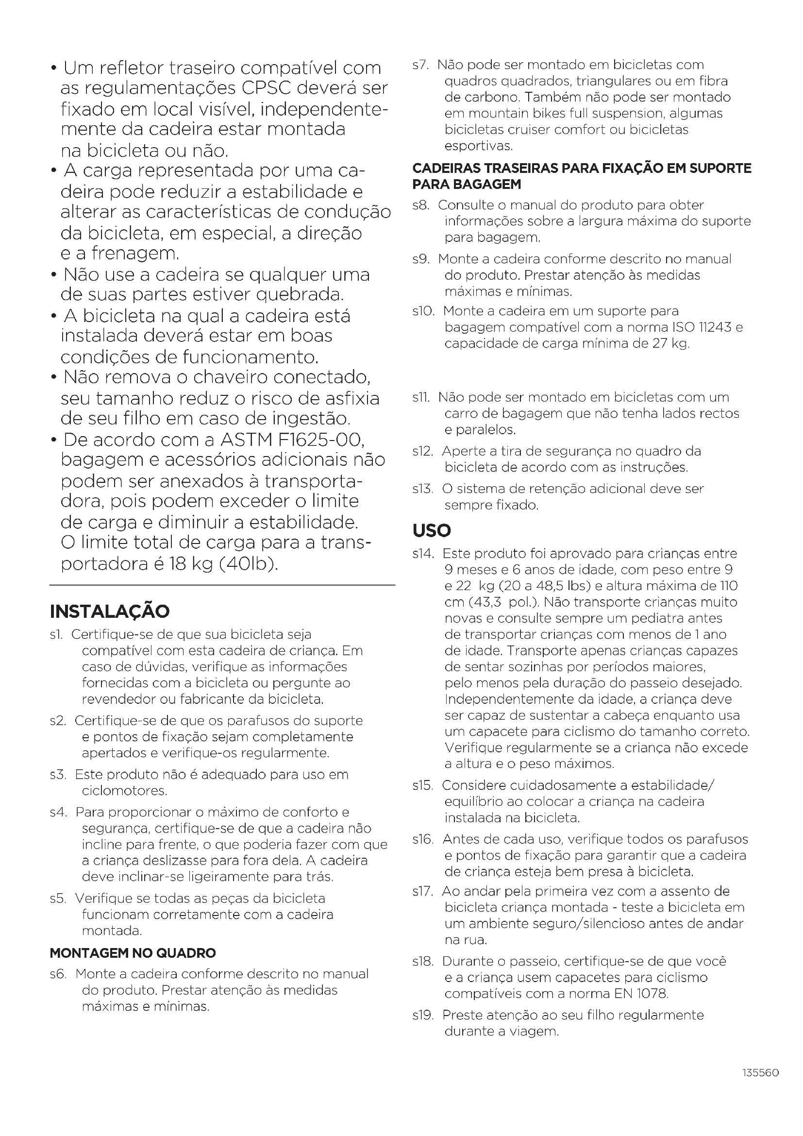 s6. Monte a cadeira conforme descrito no manual do produto. Prestar atenção às medidas máximas e mínimas. s7. Não pode ser montado em bicicletas com quadros quadrados, triangulares ou em fibra de carbono. Também não pode ser montado em mountain bikes full suspension, algumas bicicletas cruiser comfort ou bicicletas esportivas. CADEIRAS TRASEIRAS PARA FIXAÇÃO EM SUPORTE PARA BAGAGEM s8. Consulte o manual do produto para obter informações sobre a largura máxima do suporte para bagagem. s9. Monte a cadeira conforme descrito no manual do produto. Prestar atenção às medidas máximas e mínimas. s10. Monte a cadeira em um suporte para bagagem compatível com anorma ISO11243 e capacidade de carga mínima de 27 kg. s11. Não pode ser montado em bicicletas com um carro de bagagem que não tenha lados rectos e paralelos. s12. Aperte a tira de segurança no quadro da bicicleta de acordo com as instruções. s13. O sistema de retenção adicional deve ser sempre fixado. USO s14. Este produto foi aprovado para crianças entre 9 meses e 6 anos de idade, com peso entre 9 e 22 kg (20 a 48,5 lbs) e altura máxima de 110 cm (43,3 pol.). Não transporte crianças muito novas econsulte sempre um pediatra antes de transportar crianças com menos de 1 ano de idade. Transporte apenas crianças capazes de sentar sozinhas por períodos maiores, pelomenos pela duração do passeio desejado. Independentemente da idade, a criança deve ser capaz de sustentar a cabeça enquanto usa um capacete para ciclismo do tamanho correto. Verifique regularmente se a criança não excede a altura e o peso máximos. s15. Considere cuidadosamente aestabilidade/ equilíbrio ao colocar a criança na cadeira instalada na bicicleta. s16. Antes de cada uso, verifique todos os parafusos e pontos de fixação para garantir que a cadeira de criança esteja bem presa à bicicleta. s17. Ao andar pela primeira vez com a assento de bicicleta criança montada - teste a bicicleta em um ambiente seguro/silencioso antes de andar na rua. s18. Durante o passeio, certifique-se de que você e a criança usem capacetes para ciclismo compatíveis com a norma EN1078. s19. Preste atenção ao seu filho regularmente durante a viagem.14 5560140001 s20. Jamais deixe a criança sem supervisão nacadeira. s21. Nunca deixe a criança na cadeira quando a bicicleta estiver estacionada e apoiada apenas por um descanso. s22. Nunca ande de bicicleta à noite sem iluminação adequada. Não cubra os refletores ou lanternas traseiros ao usar uma cadeira em uma bicicleta. s23. A presença de uma cadeira para bicicletas pode exigir que você mude a maneira de entrar e sair da bicicleta. Preste atenção especial a isso. s24. Antes de cada passeio, certifique-se de que a cadeira montada na bicicleta não interfira com o freio, pedais ou guidão. s25. Sempre use o cinto e certifique-se deapertá-lo corretamente ao redor dacriança. Certifique-se de que o cinto e os apoios para pés não estejam soltos ou possam ficar presos em peças móveis como as rodas. Isso também se aplica ao usar a bicicleta sem uma criança na cadeira. s26. Certifique-se de que roupas, sapatos, brinquedos ou partes do corpo da criança não entrem em contato com quaisquer peças móveis da bicicleta como rodas, cabos e molas do banco. Verifique esses itens regularmente conforme a criança cresce. As molas dobanco podem ser cobertas com umaproteção para molas adequada. s27. Certifique-se de que não haja objetos afiados ao alcance da criança, por exemplo, cabos desgastados. s28. A criança sentada frequentemente precisa de roupas mais quentes do que o ciclista. Para proteger ambos contra chuvas inesperadas, recomenda-se levar roupas à prova d'água. Nunca passeie em condições perigosas ou adversas, como tempo muito frio, que possam fazer acriança sofrer ulcerações. s29. Verifique a temperatura da cadeira antes de sentar a criança, especialmente em dias quentes eensolarados. s30. Remova a cadeira ao transportar a bicicleta no carro. Aturbulência do ar pode danificar oassento ou afrouxá-lo, o que poderiaprovocar acidentes. s31. Antes do uso, verifique se há leis eregulamentações nacionais específicas aplicáveis ao transporte decrianças em cadeiras parabicicletas. s32. O fabricante não é responsável por danos decorrentes de uso além do recomendado neste manual doproprietário. MANUTENÇÃO s33. Para limpar a cadeirinha infantil, use apenas água morna com sabão. s34. Se qualquer parte da cadeirinha infantil for danificada ou quebrar, entre em contato com o revendedor Thule mais próximo.