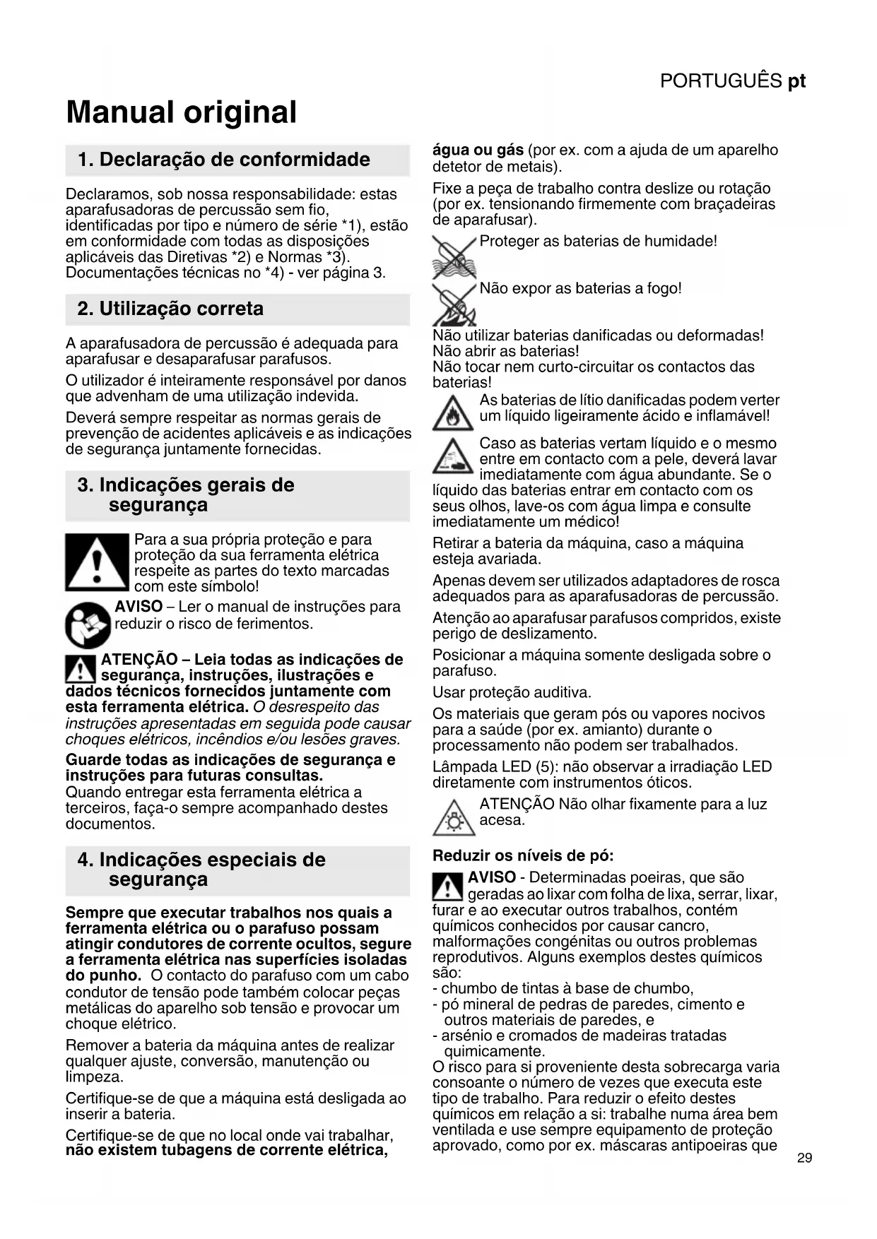 Manual original Declaramos, sob nossa responsabilidade: estas aparafusadoras de percussão sem fio, identificadas por tipo e número de série *1), estão em conformidade com todas as disposições aplicáveis das Diretivas *2) e Normas *3). Documentações técnicas no *4) - ver página 3. A aparafusadora de percussão é adequada para aparafusar e desaparafusar parafusos. O utilizador é inteiramente responsável por danos que advenham de uma utilização indevida. Deverá sempre respeitar as normas gerais de prevenção de acidentes aplicáveis e as indicações de segurança juntamente fornecidas. Para a sua própria proteção e para proteção da sua ferramenta elétrica respeite as partes do texto marcadas com este símbolo! AVISO – Ler o manual de instruções para reduzir o risco de ferimentos. ATENÇÃO – Leia todas as indicações de segurança, instruções, ilustrações e dados técnicos fornecidos juntamente com esta ferramenta elétrica. O desrespeito das instruções apresentadas em seguida pode causar choques elétricos, incêndios e/ou lesões graves. Guarde todas as indicações de segurança e instruções para futuras consultas. Quando entregar esta ferramenta elétrica a terceiros, faça-o sempre acompanhado destes documentos. Sempre que executar trabalhos nos quais a ferramenta elétrica ou o parafuso possam atingir condutores de corrente ocultos, segure a ferramenta elétrica nas superfícies isoladas do punho. O contacto do parafuso com um cabo condutor de tensão pode também colocar peças metálicas do aparelho sob tensão e provocar um choque elétrico. Remover a bateria da máquina antes de realizar qualquer ajuste, conversão, manutenção ou limpeza. Certifique-se de que a máquina está desligada ao inserir a bateria. Certifique-se de que no local onde vai trabalhar, não existem tubagens de corrente elétrica, água ou gás (por ex. com a ajuda de um aparelho detetor de metais). Fixe a peça de trabalho contra deslize ou rotação (por ex. tensionando firmemente com braçadeiras de aparafusar). Proteger as baterias de humidade! Não expor as baterias a fogo! Não utilizar baterias danificadas ou deformadas! Não abrir as baterias! Não tocar nem curto-circuitar os contactos das baterias! As baterias de lítio danificadas podem verter um líquido ligeiramente ácido e inflamável! Caso as baterias vertam líquido e o mesmo entre em contacto com a pele, deverá lavar imediatamente com água abundante. Se o líquido das baterias entrar em contacto com os seus olhos, lave-os com água limpa e consulte imediatamente um médico! Retirar a bateria da máquina, caso a máquina esteja avariada. Apenas devem ser utilizados adaptadores de rosca adequados para as aparafusadoras de percussão. Atenção ao aparafusar parafusos compridos, existe perigo de deslizamento. Posicionar a máquina somente desligada sobre o parafuso. Usar proteção auditiva. Os materiais que geram pós ou vapores nocivos para a saúde (por ex. amianto) durante o processamento não podem ser trabalhados. Lâmpada LED (5): não observar a irradiação LED diretamente com instrumentos óticos. ATENÇÃO Não olhar fixamente para a luz acesa. Reduzir os níveis de pó: AVISO - Determinadas poeiras, que são geradas ao lixar com folha de lixa, serrar, lixar, furar e ao executar outros trabalhos, contém químicos conhecidos por causar cancro, malformações congénitas ou outros problemas reprodutivos. Alguns exemplos destes químicos são: - chumbo de tintas à base de chumbo, - pó mineral de pedras de paredes, cimento e outros materiais de paredes, e - arsénio e cromados de madeiras tratadas quimicamente. O risco para si proveniente desta sobrecarga varia consoante o número de vezes que executa este tipo de trabalho. Para reduzir o efeito destes químicos em relação a si: trabalhe numa área bem ventilada e use sempre equipamento de proteção aprovado, como por ex. máscaras antipoeiras que