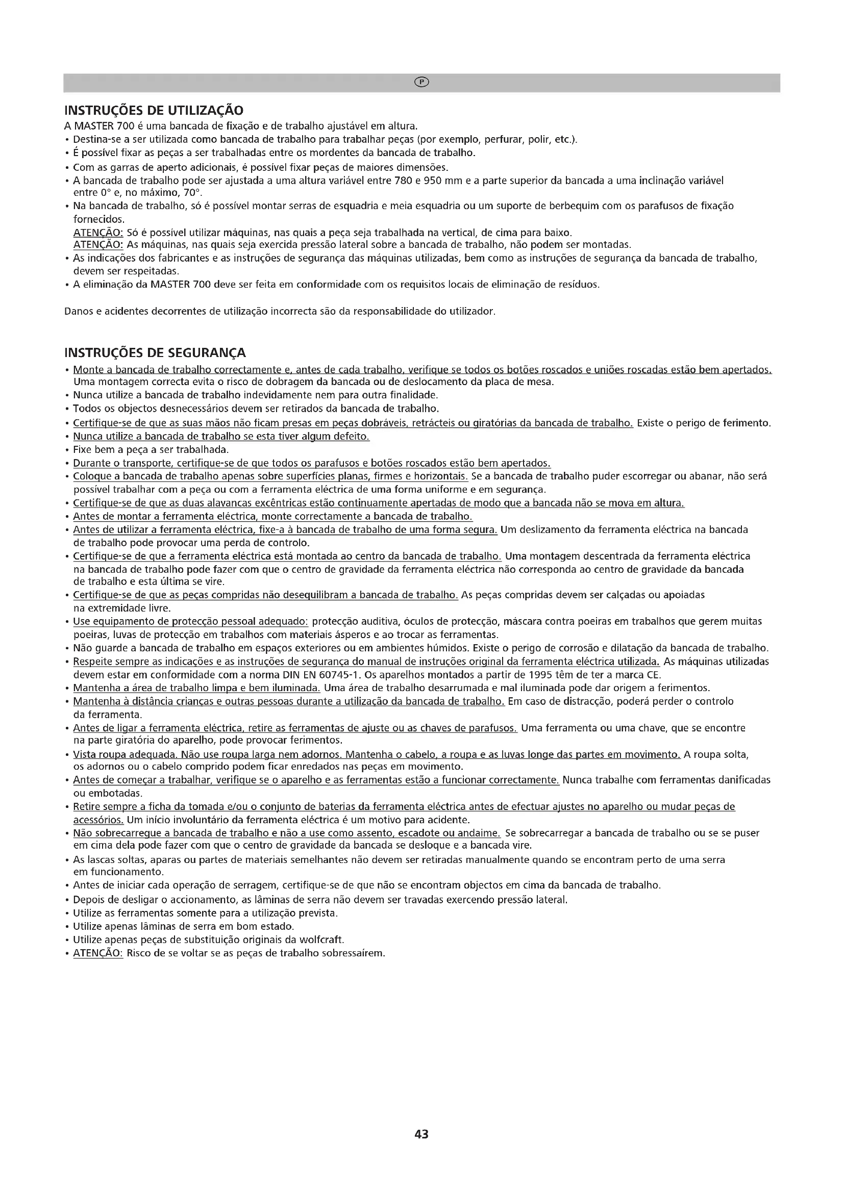 MANUAL DE UTILIZADOR Master 700 WOLFCRAFT
