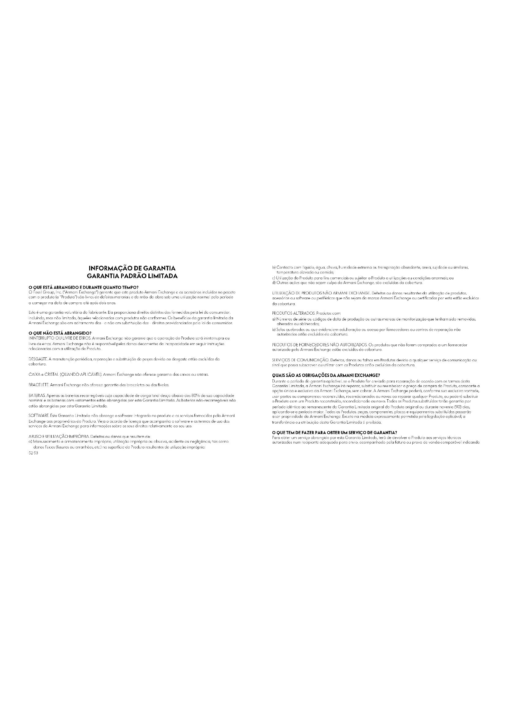 O QUE ESTÁ ABRANGIDO E DURANTE QUANTO TEMPO? O Fossil Group, Inc. (“Armani Exchange”) garante que este produto Armani Exchange e os acessórios incluídos no pacote com o produto (o “Produto”) são livres de defeitos materiais e de mão-de-obra sob uma utilização normal pelo período a começar na data de compra até após dois anos. Esta é uma garantia voluntária do fabricante. Ela proporciona direitos distintos dos fornecidos pela lei do consumidor, incluindo, mas não limitado, àqueles relacionados com produtos não conformes. Os benefícios da garantia limitada da Armani Exchange são em aditamento dos - e não em substituição dos - direitos providenciados pela lei do consumidor. O QUE NÃO ESTÁ ABRANGIDO? ININTERRUPTO OU LIVRE DE ERROS. Armani Exchange não garante que a operação do Produto será ininterrupta ou livre de erros. Armani Exchange não é responsável pelos danos decorrentes da incapacidade em seguir instruções relacionadas com a utilização do Produto. DESGASTE. A manutenção periódica, reparação e substituição de peças devido ao desgaste estão excluídas da cobertura. CAIXA e CRISTAL (QUANDO APLICÁVEL). Armani Exchange não oferece garantia das caixas ou cristais. BRACELETE. Armani Exchange não oferece garantia das braceletes ou das fivelas. BATERIAS. Apenas as baterias recarregáveis cuja capacidade de carga total desça abaixo dos 80% da sua capacidade nominal e as baterias com vazamentos estão abrangidas por esta Garantia Limitada. As baterias não-recarregáveis não estão abrangidas por esta Garantia Limitada. SOFTWARE. Esta Garantia Limitada não abrange o software integrado no produto e os serviços fornecidos pela Armani Exchange aos proprietários do Produto. Veja o acordo de licença que acompanha o software e os termos de uso dos serviços da Armani Exchange para informações sobre os seus direitos relativamente ao seu uso. ABUSO E UTILIZAÇÃO IMPRÓPRIA. Defeitos ou danos que resultem de: a) Manuseamento e armazenamento impróprio, utilização imprópria ou abusiva, acidente ou negligência, tais como danos físicos (fissuras ou arranhões, etc.) na superfície do Produto resultantes de utilização imprópria; b) Contacto com líquido, água, chuva, humidade extrema ou transpiração abundante, areia, sujidade ou similares, temperatura elevada ou comida; c) Utilização do Produto para fins comerciais ou sujeitar o Produto a utilizações ou condições anormais; ou d) Outras ações que não sejam culpa da Armani Exchange, são excluídas da cobertura. UTILIZAÇÃO DE PRODUTOS NÃO ARMANI EXCHANGE. Defeitos ou danos resultantes da utilização de produtos, acessórios ou software ou periféricos que não sejam da marca Armani Exchange ou certificados por esta estão excluídos da cobertura. PRODUTOS ALTERADOS. Produtos com: a) Números de série ou códigos de data de produção ou outras marcas de monitorização que tenham sido removidas, alteradas ou obliteradas; b) Selos quebrados ou que evidenciem adulteração ou acesso por fornecedores ou centros de reparação não autorizados estão excluídos da cobertura. PRODUTOS DE FORNECEDORES NÃO AUTORIZADOS. Os produtos que não forem comprados a um fornecedor autorizado pela Armani Exchange estão excluídos da cobertura. SERVIÇOS DE COMUNICAÇÃO. Defeitos, danos ou falhas em Produtos devido a qualquer serviço de comunicação ou sinal que possa subscrever ou utilizar com os Produtos estão excluídos da cobertura. QUAIS SÃO AS OBRIGAçÕES DA ARMANI EXCHANGE? Durante o período de garantia aplicável, se o Produto for enviado para reparação de acordo com os termos desta Garantia Limitada, a Armani Exchange irá reparar, substituir ou reembolsar o preço de compra do Produto, consoante a opção única e exclusiva da Armani Exchange, sem cobrar. A Armani Exchange poderá, conforme sua exclusiva vontade, usar partes ou componentes reconstruídos, recondicionados ou novos ao reparar qualquer Produto, ou poderá substituir o Produto com um Produto reconstruído, recondicionado ou novo. Todos os Produtos substituídos terão garantia por período idêntico ao remanescente da Garantia Limitada original do Produto original ou durante noventa (90) dias, aplicando-se o período maior. Todos os Produtos, peças, componentes, placas e equipamentos substituídos passarão a ser propriedade da Armani Exchange. Exceto na medida expressamente permitida pela legislação aplicável, a transferência ou atribuição desta Garantia Limitada é proibida. O QUE TEM DE FAZER PARA OBTER UM SERVIçO DE GARANTIA? Para obter um serviço abrangido por esta Garantia Limitada, terá de devolver o Produto aos serviços técnicos autorizados num recipiente adequado para envio, acompanhado pela fatura ou prova de venda comparável indicando54 55 a data de compra original, o número de série do Produto e o nome e morada do vendedor. Se a Armani Exchange determinar que um Produto não está abrangido por esta Garantia Limitada, terá de pagar todas as peças e custos de envio e de mão-de-obra para a reparação ou devolução de tal Produto. Para encontrar o centro de assistência internacional autorizado mais próximo, por favor, visite www.axconnected.com Não serão reinstalados quaisquer dados, software ou aplicações adicionadas ao seu Produto. Deverá manter uma cópia separada de quaisquer conteúdos no Produto antes de entregar o Produto a Armani Exchange para serviço de garantia, dado que alguns ou todos os conteúdos poderão ser eliminados ou reformatados durante o serviço de garantia. QUAIS SÃO OS LIMITES DA RESPONSABILIDADE DA ARMANI EXCHANGE? AS SEGUINTES GARANTIAS E DIREITOS SÃO EXCLUSIVOS E SUBSTITUEM TODAS AS OUTRAS GARANTIAS, TERMOS OU CONDIÇÕES, EXPRESSAS, IMPLÍCITAS OU ESTATUÁRIAS, RELATIVAMENTE A QUALQUER ASSUNTO, INCLUINDO, SEM LIMITAÇÃO, GARANTIAS DE COMERCIALIZAÇÃO, GINÁSTICA OU OBJETIVO PARTICULAR, PRECISÃO, QUALIDADE SATISFATÓRIA, DE TÍTULO E NÃO 