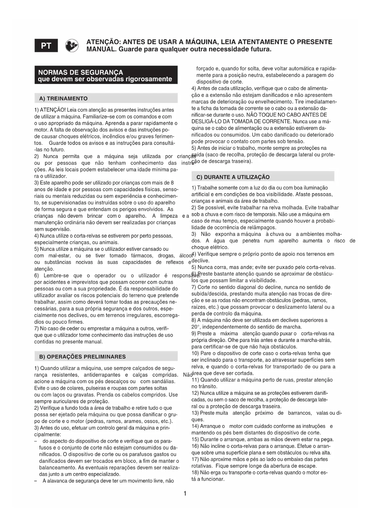 que devem ser observadas rigorosamente A) TREINAMENTO 1) ATENÇÃO! Leia com atenção as presentes instruções antes de utilizar a máquina. Familiarize–se com os comandos e com o uso apropriado da máquina. Aprenda a parar rapidamente o motor. A falta de observação dos avisos e das instruções po- de causar choques elétricos, incêndios e/ou graves ferimen- tos. Guarde todos os avisos e as instruções para consultá- -las no futuro. 2) Nunca permita que a máquina seja utilizada por crianças ou por pessoas que não tenham conhecimento das instru- ções. As leis locais podem estabelecer uma idade mínima pa- ra o utilizador. 3) Este aparelho pode ser utilizado por crianças com mais de 8 anos de idade e por pessoas com capacidades físicas, senso- riais ou mentais reduzidas ou sem experiência e conhecimen- to, se supervisionadas ou instruídas sobre o uso do aparelho de forma segura e que entendam os perigos envolvidos. As crianças não devem brincar com o aparelho. A limpeza e a manutenção ordinária não devem ser realizadas por crianças sem supervisão. 4) Nunca utilize o corta-relvas se estiverem por perto pessoas, especialmente crianças, ou animais. 5) Nunca utilize a máquina se o utilizador estiver cansado ou com mal-estar, ou se tiver tomado fármacos, drogas, álcool ou substâncias nocivas às suas capacidades de reexos e atenção. 6) Lembre-se que o operador ou o utilizador é responsável por acidentes e imprevistos que possam ocorrer com outras pessoas ou com a sua propriedade. É da responsabilidade do utilizador avaliar os riscos potenciais do terreno que pretende trabalhar, assim como deverá tomar todas as precauções ne- cessárias, para a sua própria segurança e dos outros, espe- cialmente nos declives, ou em terrenos irregulares, escorrega- dios ou pouco rmes. 7) No caso de ceder ou emprestar a máquina a outros, veri- que que o utilizador tome conhecimento das instruções de uso contidas no presente manual.