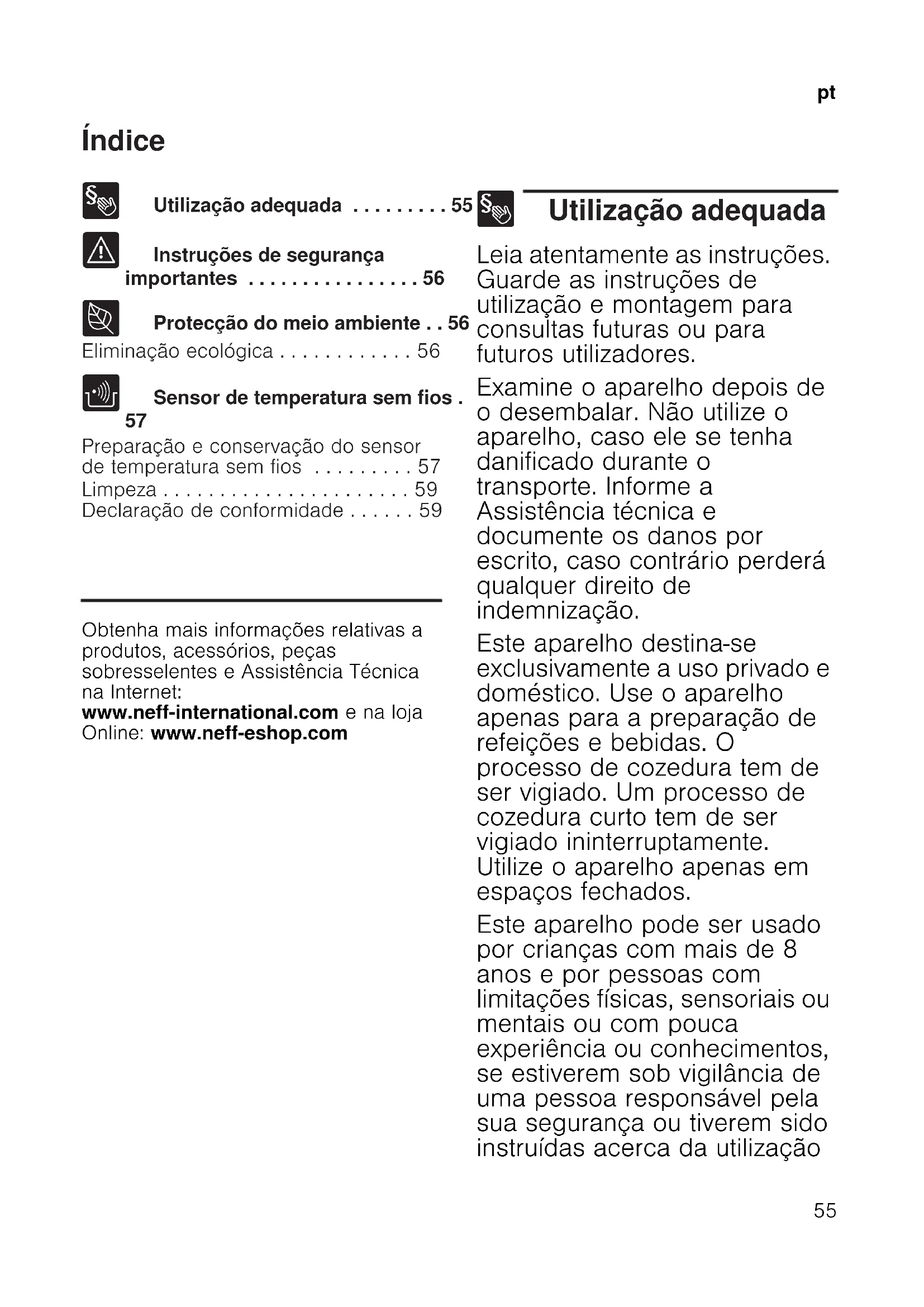 Preparação e conservação do sensor de temperatura sem fios . . . . . . . . . 57 Limpeza . . . . . . . . . . . . . . . . . . . . . . 59 Declaração de conformidade . . . . . . 59 Produktinfo Obtenha mais informações relativas a produtos, acessórios, peças sobresselentes e Assistência Técnica na Internet: www.neff-international.com e na loja Online: www.neff-eshop.com 8 Utilização adequada Utilização adequada Leia atentamente as instruções. Guarde as instruções de utilização e montagem para consultas futuras ou para futuros utilizadores. Examine o aparelho depois de o desembalar. Não utilize o aparelho, caso ele se tenha danificado durante o transporte. Informe a Assistência técnica e documente os danos por escrito, caso contrário perderá qualquer direito de indemnização. Este aparelho destina-se exclusivamente a uso privado e doméstico. Use o aparelho apenas para a preparação de refeições e bebidas. O processo de cozedura tem de ser vigiado. Um processo de cozedura curto tem de ser vigiado ininterruptamente. Utilize o aparelho apenas em espaços fechados. Este aparelho pode ser usado por crianças com mais de 8 anos e por pessoas com limitações físicas, sensoriais ou mentais ou com pouca experiência ou conhecimentos, se estiverem sob vigilância de uma pessoa responsável pela sua segurança ou tiverem sido instruídas acerca da utilizaçãopt