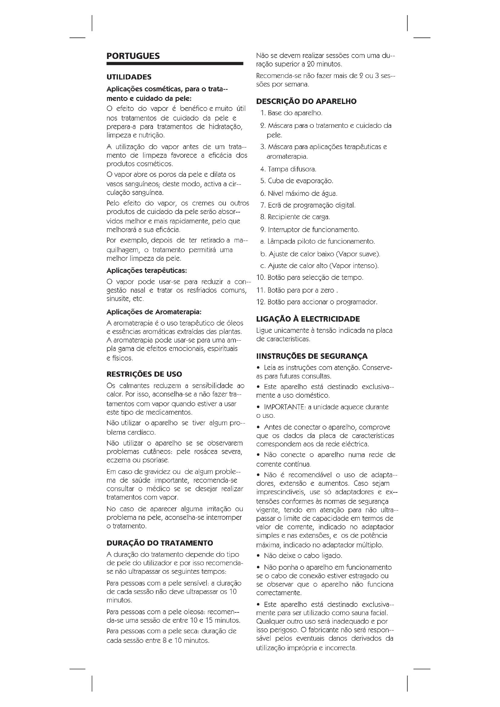 - Este aparelho está destinado exclusiva-- mente para ser utilizado como sauna facial. Qualquer outro uso será inadequado e por isso perigoso. O fabricante não será respon-- sável pelos eventuais danos derivados da utilização imprópria e incorrecta.• Para evitar sobreaquecimentos, desenrole o cabo de alimentação na sua totalidade.