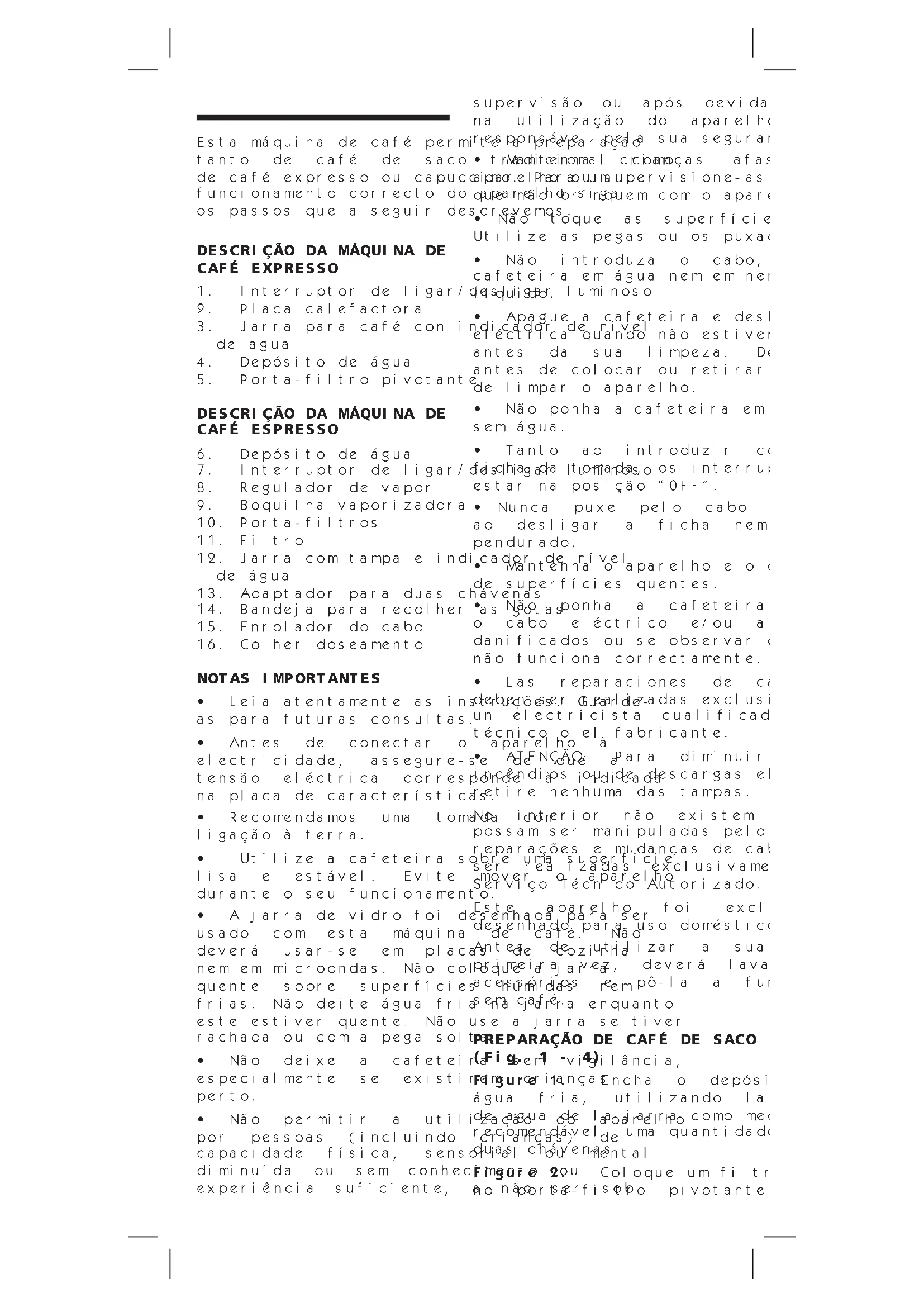 - Não ponha a cafeteira a funcionar se o cabo eléctrico e/ou a ficha estiverem danificados ou se observar que o aparelho não funciona correctamente.