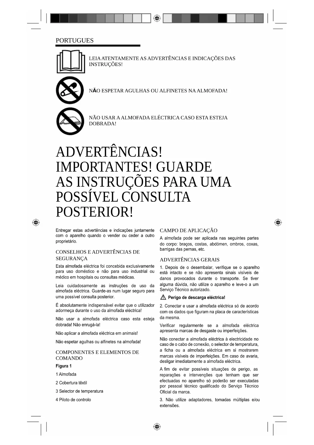 SEGURANÇA Esta almofada eléctrica foi concebida exclusivamente para uso doméstico e não para uso industrial ou médico em hospitais ou consultas médicas. Leia cuidadosamente as instruções de uso da almofada eléctrica. Guarde-as num lugar seguro para uma possível consulta posterior. É absolutamente indispensável evitar que o utilizador adormeça durante o uso da almofada eléctrica! Não usar a almofada eléctrica caso esta esteja dobrada! Não enrugá-la! Não aplicar a almofada eléctrica em animais! Não espetar agulhas ou alfinetes na almofada!