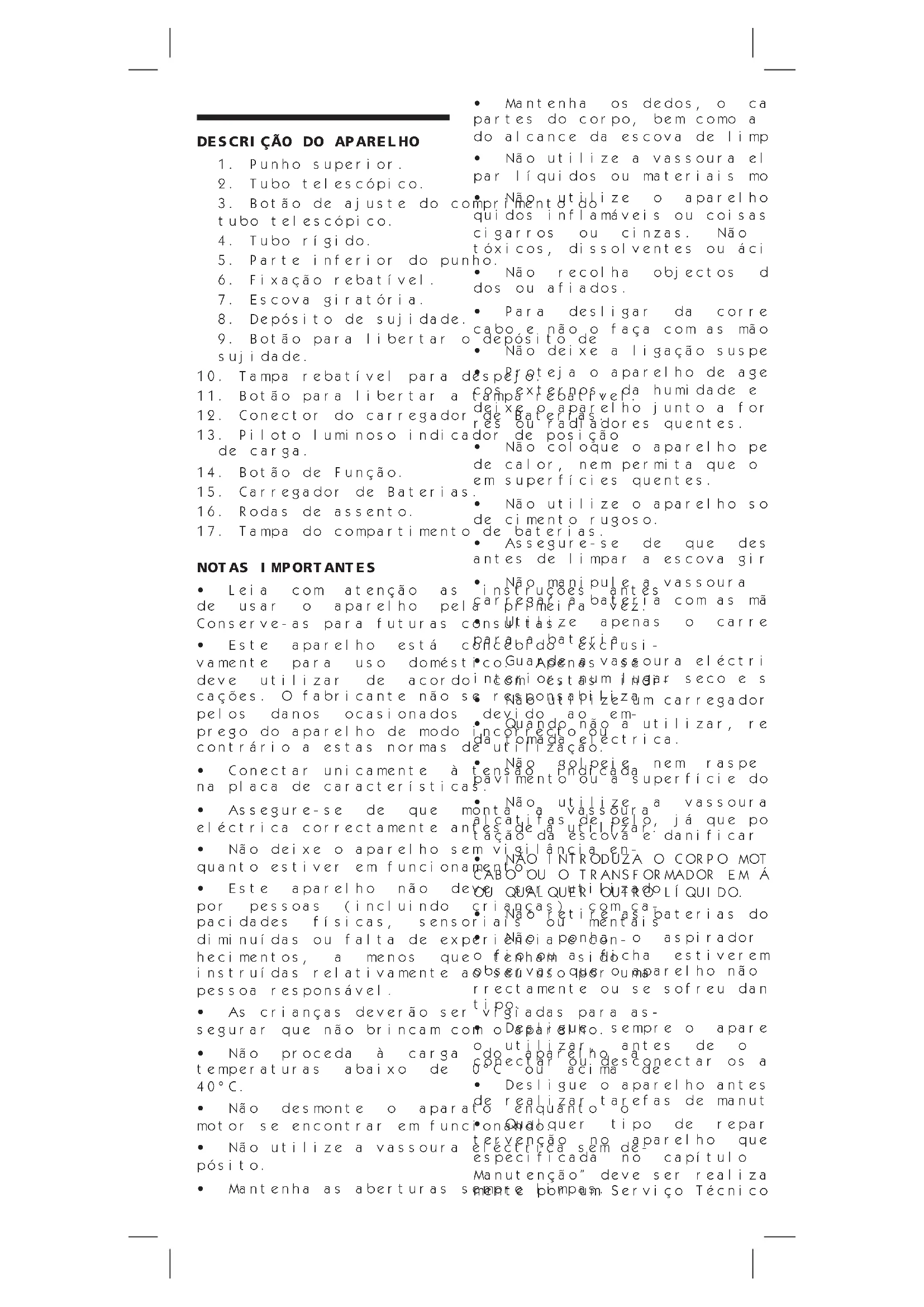 - Não utilize a vassoura eléctrica sobre alcatifas de pelo, já que pode afectar a ro- tação da escova e danificar o motor.