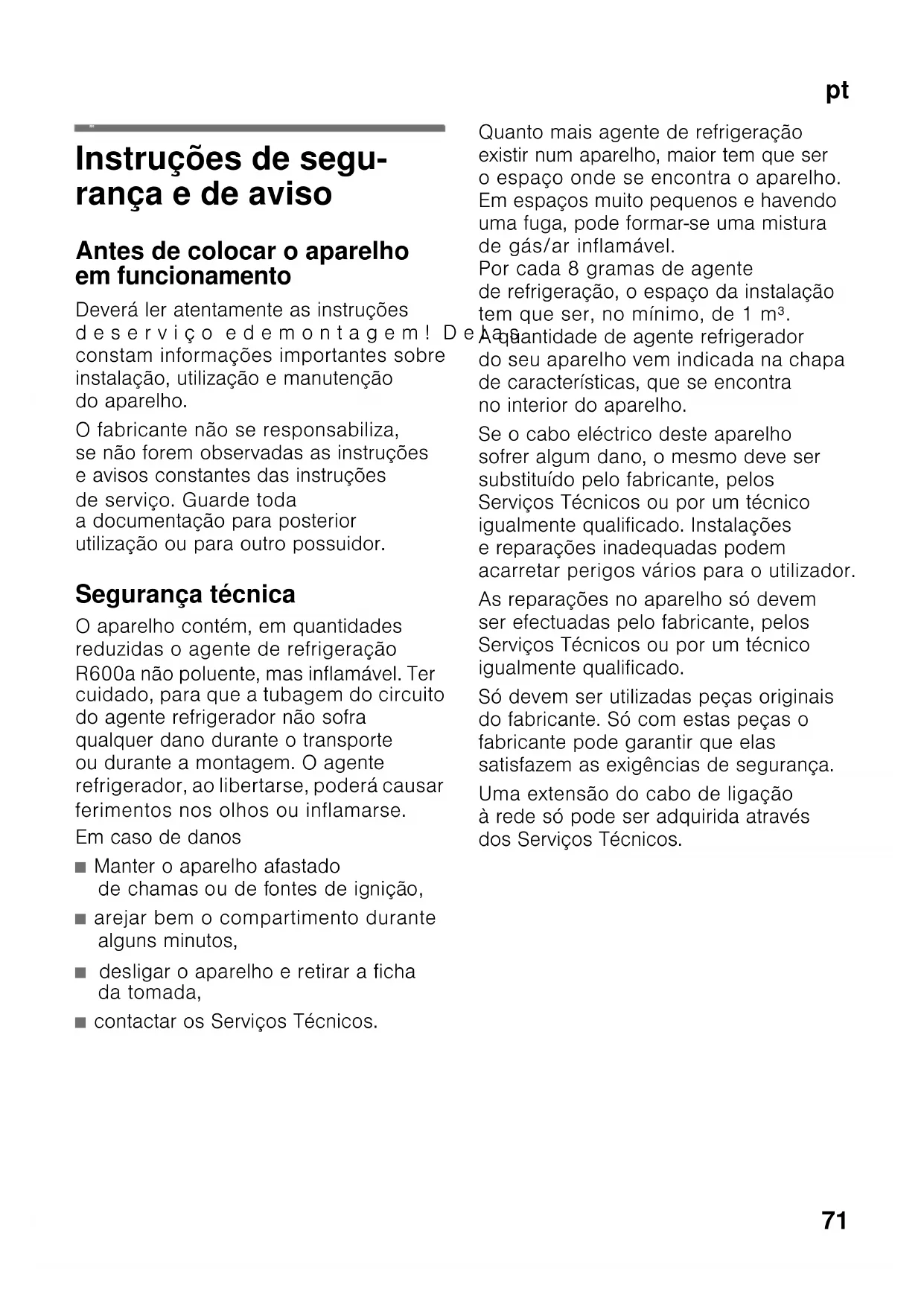 ptÍn dice ptIn struções de serviç o Instruções de segu- rança e de aviso Antes de colocar o aparelho em funcionamento Deverá ler atentamente as instruções deserviço edemontagem! Delas constam informações importantes sobre instalação, utilização e manutenção do aparelho. O fabricante não se responsabiliza, se não forem observadas as instruções e avisos constantes das instruções de serviço. Guarde toda a documentação para posterior utilização ou para outro possuidor. Segurança técnica O aparelho contém, em quantidades reduzidas o agente de refrigeração R600a não poluente, mas inflamável. Ter cuidado, para que a tubagem do circuito do agente refrigerador não sofra qualquer dano durante o transporte ou durante a montagem. O agente refrigerador, ao libertarse, poderá causar ferimentos nos olhos ou inflamarse. Em caso de danos ■ Manter o aparelho afastado de chamas ou de fontes de ignição, ■ arejar bem o compartimento durante alguns minutos, ■ desligar o aparelho e retirar a ficha da tomada, ■ contactar os Serviços Técnicos. Quanto mais agente de refrigeração existir num aparelho, maior tem que ser o espaço onde se encontra o aparelho. Em espaços muito pequenos e havendo uma fuga, pode formar-se uma mistura de gás/ar inflamável. Por cada 8 gramas de agente de refrigeração, o espaço da instalação tem que ser, no mínimo, de 1 m³. A quantidade de agente refrigerador do seu aparelho vem indicada na chapa de características, que se encontra no interior do aparelho. Se o cabo eléctrico deste aparelho sofrer algum dano, o mesmo deve ser substituído pelo fabricante, pelos Serviços Técnicos ou por um técnico igualmente qualificado. Instalações e reparações inadequadas podem acarretar perigos vários para o utilizador. As reparações no aparelho só devem ser efectuadas pelo fabricante, pelos Serviços Técnicos ou por um técnico igualmente qualificado. Só devem ser utilizadas peças originais do fabricante. Só com estas peças o fabricante pode garantir que elas satisfazem as exigências de segurança. Uma extensão do cabo de ligação à rede só pode ser adquirida através dos Serviços Técnicos.pt