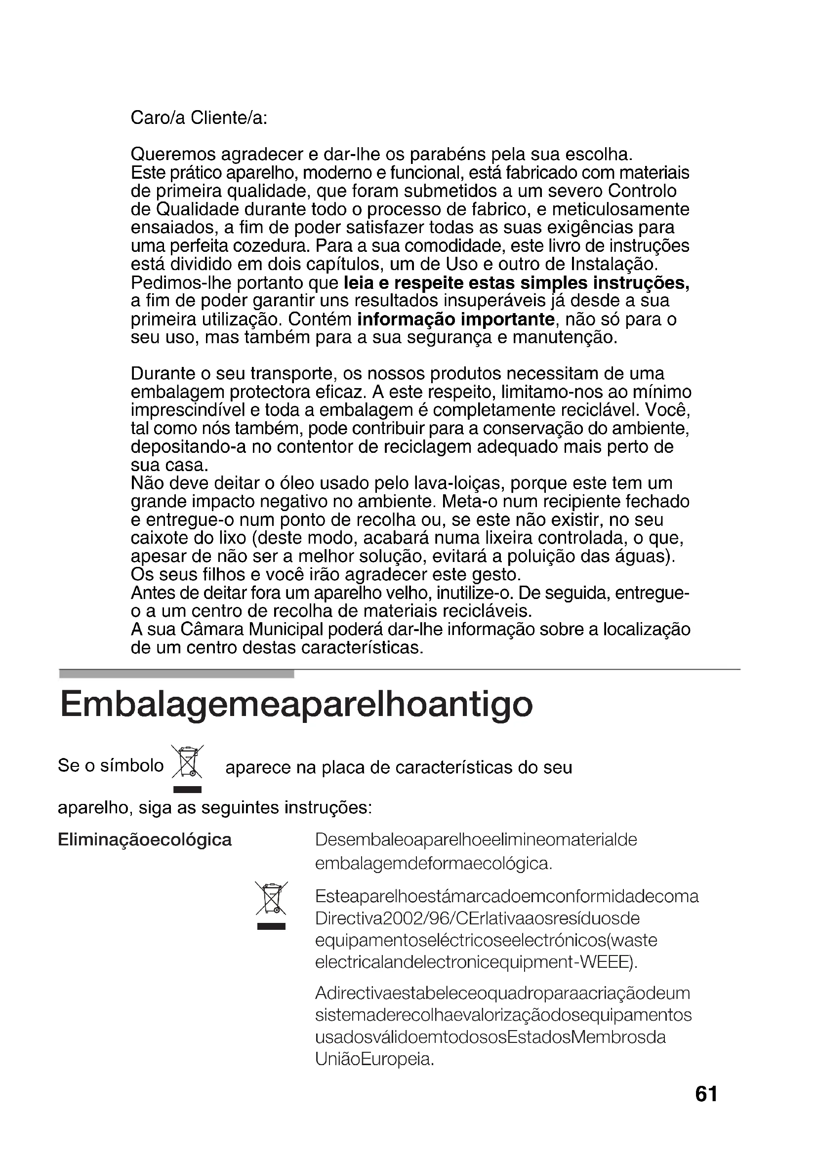 61CONTENTS Avisos de Segurança Assim apresenta-se a Placa de Cozedura Queimador de Gás Diâmetros dos recipientes aconselhados Conselhos para cozinhar Normas de Uso para Cristal: Cozinhado Normas de Uso para Cristal: Limpeza e Conservação Situações anómalas Condições de Garantia