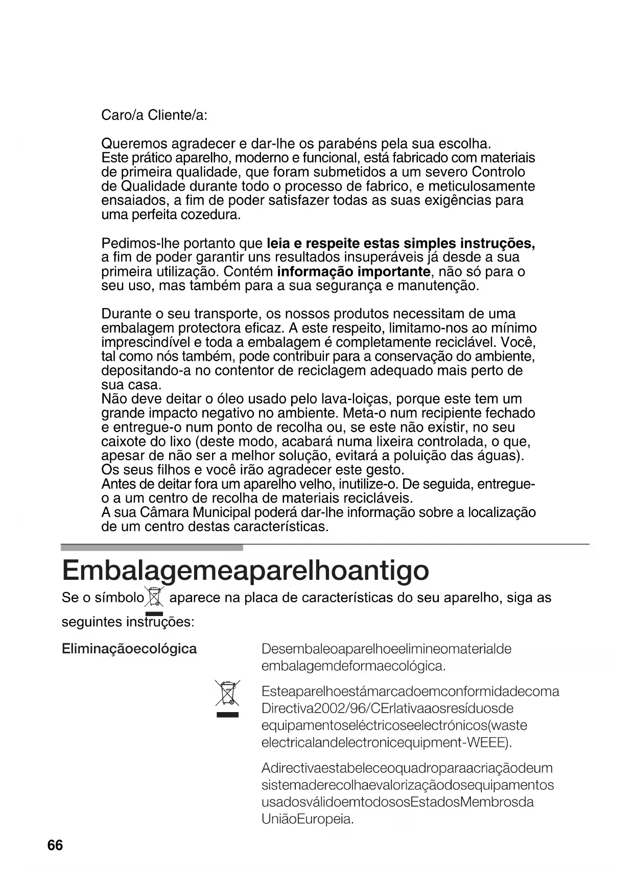 Se o símbolo aparece na placa de características do seu aparelho, siga as seguintes instruçoes: 4*45&." %& 3&$0-)" & 7"-03*;"A=0 %04 &26*1".&/504 uma perfeita cozedura. 66CONTENTS Avisos de Segurança Assim apresenta-se a Placa de Cozedura Queimador de Gás Diâmetros dos recipientes aconselhados Conselhos para cozinhar Placas eléctricas Com regulador de 10 posições Normas de Uso para Cristal: Cozinhado Normas de Uso para Cristal: Limpeza e Conservação Situações anómalas Condições de Garantia
