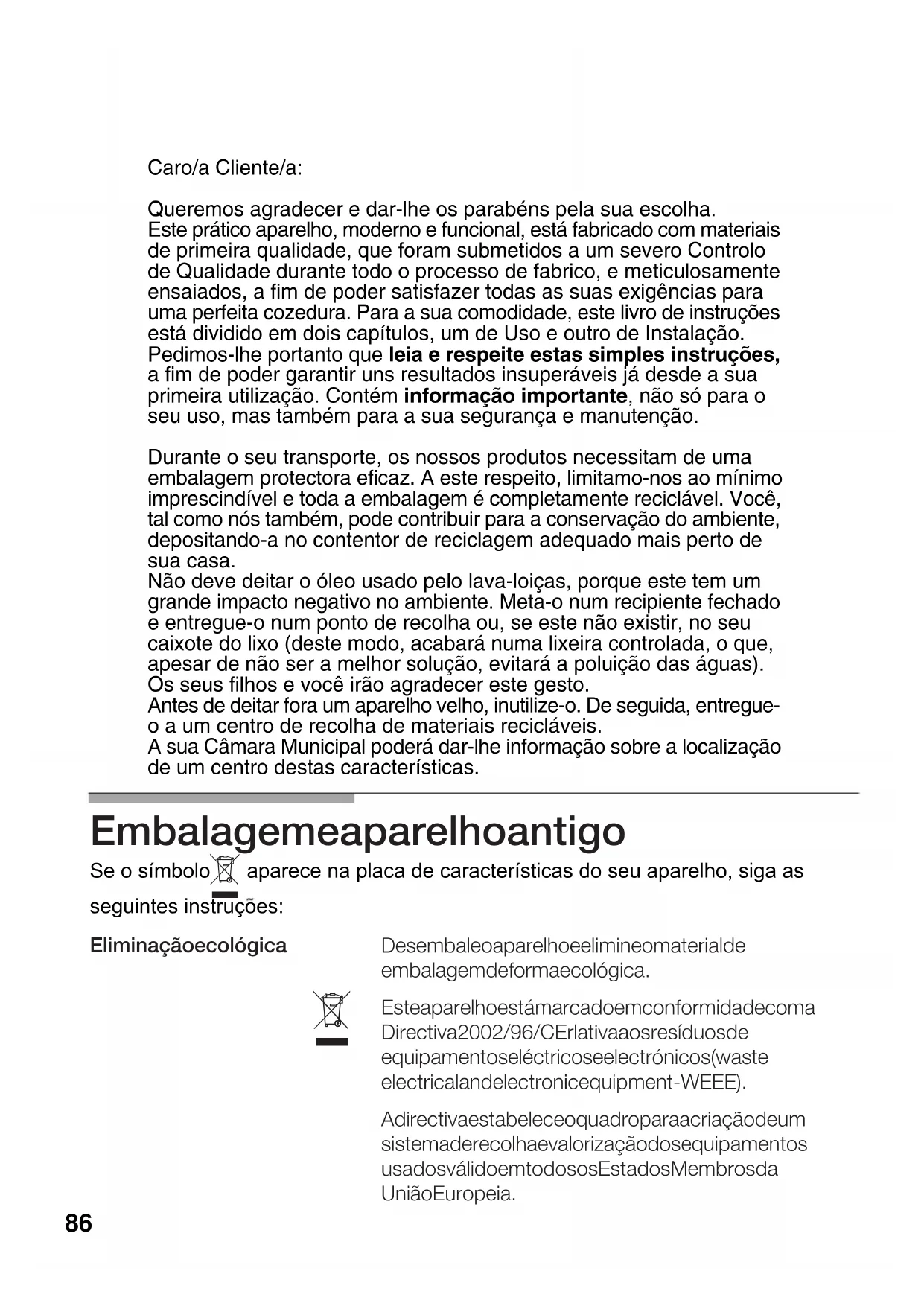 Se o símbolo aparece na placa de características do seu aparelho, siga as seguintes instruçoes: 4*45&." %& 3&$0-)" & 7"-03*;"A=0 %04 &26*1".&/504 86CONTENTS Avisos de Segurança Assim apresenta-se a Placa de Cozedura Queimador de Gás Diâmetros dos recipientes aconselhados Conselhos para cozinhar Normas de Uso para Cristal: Cozinhado Normas de Uso para Cristal: Limpeza e Conservação Situações anómalas Condições de Garantia Função despertador Programado Outras funções O visor digital