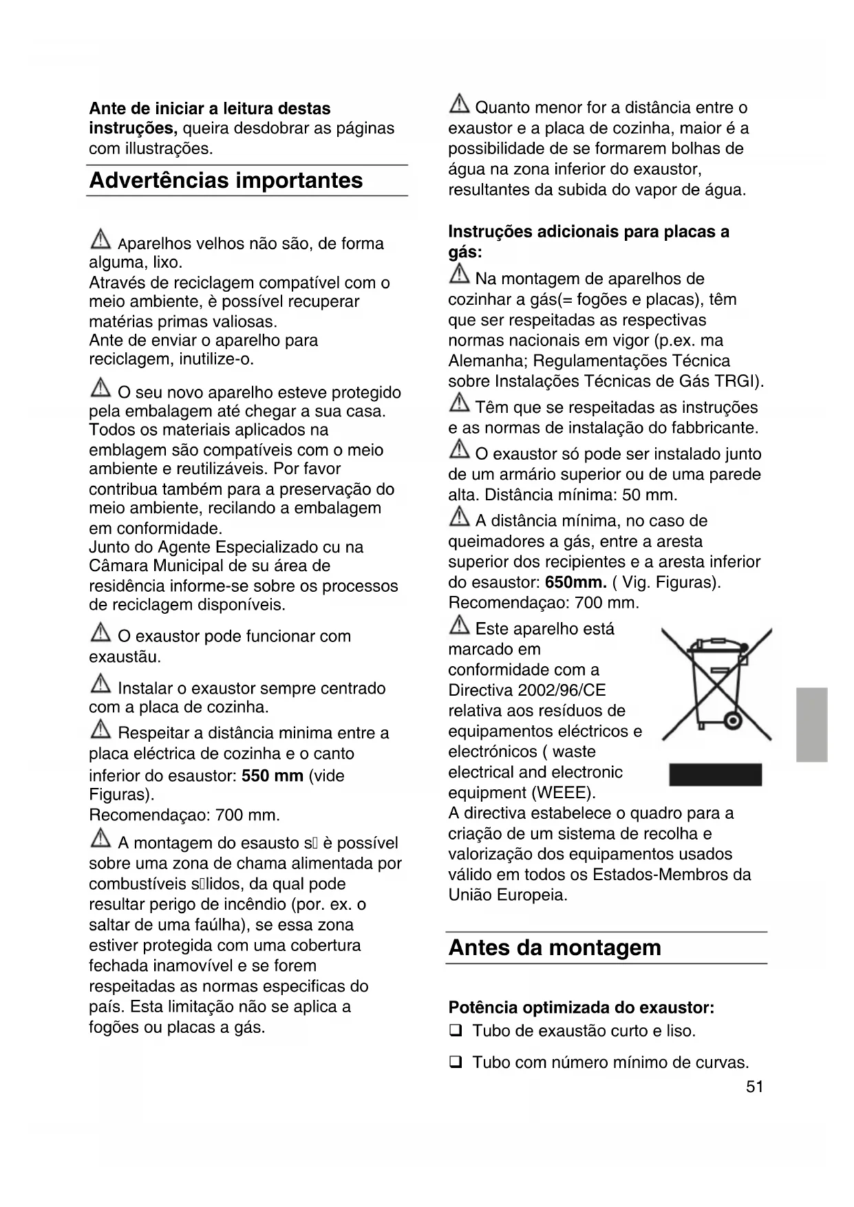 Ante de iniciar a leitura destas instruções, queira desdobrar as páginas com illustrações. Advertências importantes Aparelhos velhos não são, de forma alguma, lixo. Através de reciclagem compatível com o meio ambiente, è possível recuperar matérias primas valiosas. Ante de enviar o aparelho para reciclagem, inutilize-o. O seu novo aparelho esteve protegido pela embalagem até chegar a sua casa. Todos os materiais aplicados na emblagem são compatíveis com o meio ambiente e reutilizáveis. Por favor contribua também para a preservação do meio ambiente, recilando a embalagem em conformidade. Junto do Agente Especializado cu na Câmara Municipal de su área de residência informe-se sobre os processos de reciclagem disponíveis. O exaustor pode funcionar com exaustãu. Instalar o exaustor sempre centrado com a placa de cozinha. Respeitar a distância minima entre a placa eléctrica de cozinha e o canto inferior do esaustor: 550 mm (vide Figuras). Recomendaçao: 700 mm. A montagem do esausto s è possível sobre uma zona de chama alimentada por combustíveis slidos, da qual pode resultar perigo de incêndio (por. ex. o saltar de uma faúlha), se essa zona estiver protegida com uma cobertura fechada inamovível e se forem respeitadas as normas especificas do país. Esta limitação não se aplica a fogões ou placas a gás. Quanto menor for a distância entre o exaustor e a placa de cozinha, maior é a possibilidade de se formarem bolhas de água na zona inferior do exaustor, resultantes da subida do vapor de água. Instruções adicionais para placas a gás: Na montagem de aparelhos de cozinhar a gás(= fogões e placas), têm que ser respeitadas as respectivas normas nacionais em vigor (p.ex. ma Alemanha; Regulamentações Técnica sobre Instalações Técnicas de Gás TRGI). Têm que se respeitadas as instruções e as normas de instalação do fabbricante. O exaustor só pode ser instalado junto de um armário superior ou de uma parede alta. Distância mínima: 50 mm. A distância mínima, no caso de queimadores a gás, entre a aresta superior dos recipientes e a aresta inferior do esaustor: 650mm. ( Vig. Figuras). Recomendaçao: 700 mm. Este aparelho está marcado em conformidade com a Directiva 2002/96/CE relativa aos resíduos de equipamentos eléctricos e electrónicos ( waste electrical and electronic equipment (WEEE). A directiva estabelece o quadro para a criação de um sistema de recolha e valorização dos equipamentos usados válido em todos os Estados-Membros da União Europeia. Antes da montagem Potência optimizada do exaustor: Tubo de exaustão curto e liso. Tubo com número mínimo de curvas.52