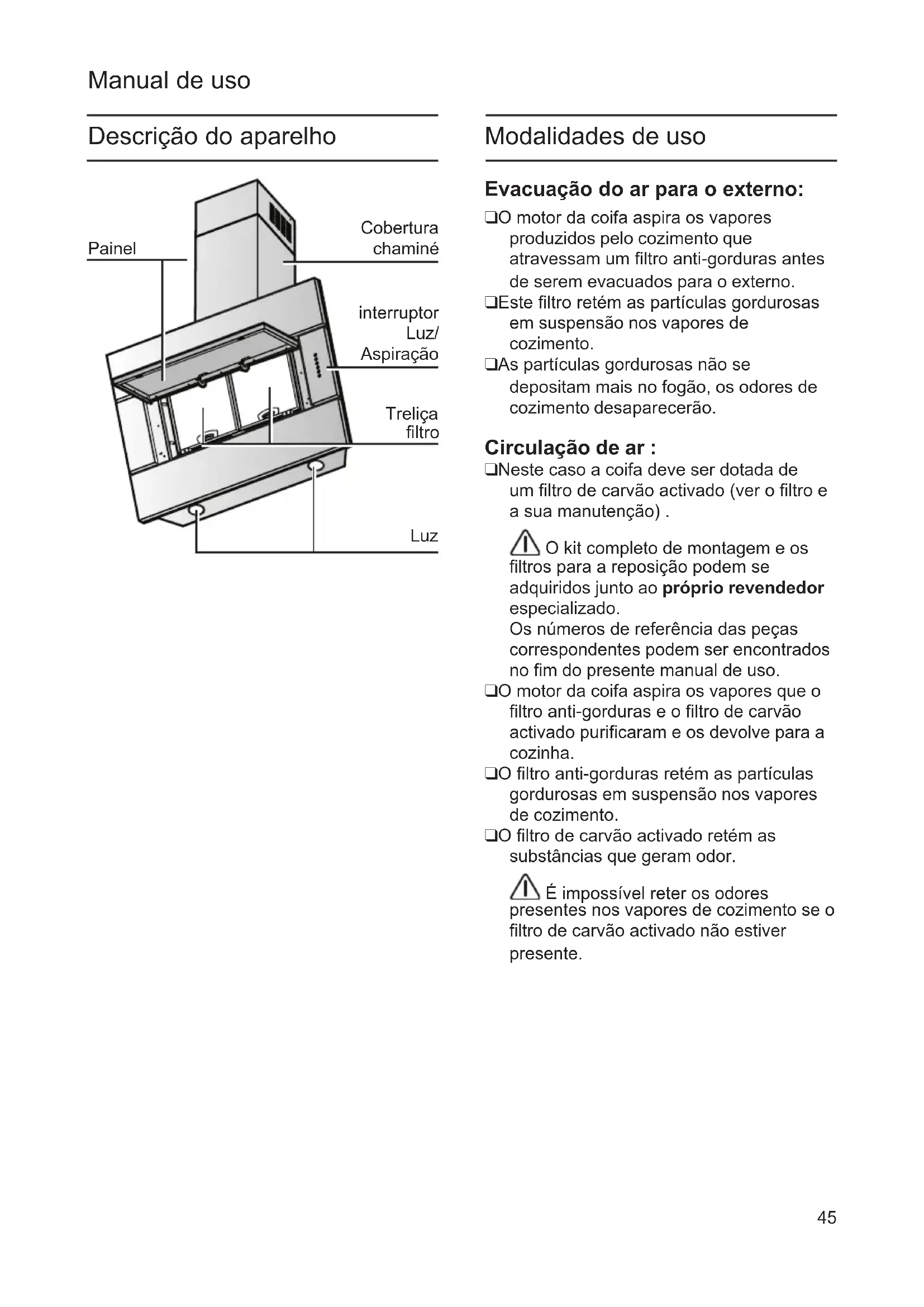 insertar el enchufe en la toma de corriente o conectar la corriente al cuadro eléctrico. Problemas de funcionamiento Para eventuales preguntas o en caso de problemas relacionados con el funcionamiento, llamar el servicio de asistencia. (Ver la lista de los centros de asistencia). Durante la llamada, indicar los siguientes números: N° E FD Señalar aquí los números correspondientes de su campana en el cuadro aquí arriba. El número E (n° de producto) y FD (fecha de producción) se encuentran dentro del aparato, en la placa de datos que puede verse una vez sacada la rejilla.45 Manual de uso Modalidades de uso Evacuação do ar para o externo: ❑ O motor da coifa aspira os vapores produzidos pelo cozimento que atravessam um filtro anti-gorduras antes de serem evacuados para o externo. ❑ Este filtro retém as partículas gordurosas em suspensão nos vapores de cozimento. ❑ As partículas gordurosas não se depositam mais no fogão, os odores de cozimento desaparecerão. Circulação de ar : ❑ Neste caso a coifa deve ser dotada de um filtro de carvão activado (ver o filtro e a sua manutenção) . O kit completo de montagem e os filtros para a reposição podem se adquiridos junto ao próprio revendedor especializado. Os números de referência das peças correspondentes podem ser encontrados no fim do presente manual de uso. ❑ O motor da coifa aspira os vapores que o filtro anti-gorduras e o filtro de carvão activado purificaram e os devolve para a cozinha. ❑ O filtro anti-gorduras retém as partículas gordurosas em suspensão nos vapores de cozimento. ❑ O filtro de carvão activado retém as substâncias que geram odor. É impossível reter os odores presentes nos vapores de cozimento se o filtro de carvão activado não estiver presente. Descrição do aparelho Cobertura chaminé interruptor Luz/ Aspiração Luz Treliça filtro Painel46 Antes do uso Advertências importantes: ❑ O presente manual de uso vale para várias versões do aparelho e, portanto, pode conter descrições de acessórios não presentes no próprio aparelho. ❑ Esta coifa de aspiração está em conformidade com as disposições de segurança vigentes. As reparações somente devem ser efectuadas por um especialista. Reparações executadas por pessoas não qualificadas aumentam consideravelmente os riscos para o usuário. ❑ Ler cuidadosamente o presente manual de uso antes de utilizar o aparelho pela primeira vez. O mesmo contém informações importantes não somente para a própria segurança, mas também para o uso e a manutenção do aparelho. ❑ Conservar o presente manual de instalação e de uso para um futuro proprietário do aparelho. Descarregar os materiais da embalagem em conformidade com as leis vigentes (ver manual de instalação). Esta coifa de aspiração somente se destina ao uso doméstico. Antes de qualquer operação de limpeza ou manutenção, desligar a coifa da rede eléctrica tirando a ficha ou desligando o interruptor geral da habitação. O aparelho não se destina ao uso por parte de crianças ou pessoas com capacidades físicas, sensoriais ou mentais reduzidas e com falta de experiência e conhecimento excepto se as mesmas não estiverem sendo supervisionadas ou instruídas no uso da aparelhagem por parte de uma pessoa responsável pela segurança das mesmas. As crianças devem ser controladas de maneira que não brinquem com o aparelho. Nunca utilizar a coifa sem a grelha correctamente montada! A coifa NUNCA deve ser utilizada como plano de apoio excepto se isto não tiver sido expressamente indicado. Quando a coifa de cozinha é utilizada contemporaneamente com outros aparelhos a combustão de gás ou outros combustíveis o local deve dispor de suficiente ventilação. O ar aspirado não deve ser transportado por meio de ductos usados para a descarga dos fumos produzidos por aparelhos a combustão de gás ou de outros combustíveis. É severamente proibido cozinhar alimentos directamente na chama sob a coifa. O emprego de chama livre é danoso para os filtros e pode dar lugar a incêndios, portanto, deve ser absolutamente evitado. A fritura deve ser feita sob controlo de modo a evitar que o óleo superaquecido se incendeie. No que diz respeito às medidas técnicas e de segurança a serem adoptadas para a descarga dos fumos, ater-se estritamente a quanto previsto pelos regulamentos das autoridades competentes locais. A coifa deve ser limpa frequentemente tanto interna quanto externamente (PELO MENOS UMA VEZ POR MÊS, todavia, respeitar quanto expressamente indicado nas instruções de manutenção indicadas neste manual). A inobservância das normas de limpeza da coifa e da substituição e limpeza dos filtros comporta riscos de incêndio. Não utilizar ou deixar a coifa sem lâmpadas correctamente montadas devido ao possível risco de choque eléctrico. Declina-se qualquer responsabilidade por eventuais inconvenientes, danos ou incêndios provocados ao aparelho derivantes da inobservância das instruções indicadas neste manual.47 Uso da coifa de aspiração (tecla lampejante) em seguida a aspiração desliga ou volta para a velocidade (potência) de aspiração anteriormente seleccionada. Nota: É possível controlar esta função de modo que a coifa, se desligue, em qualquer caso, após os 5 minutos de funcionamento (mesmo se anteriormente outra velocidade (potência) de aspiração estava seleccionada), para tanto, após ter pressionado a tecla, pressionar novamente e mantê-la pressionada, a tecla iniciará a lampejar indicando que a função desejada foi programada. Tecla reset saturação filtros: a coifa, por meio da sinalização luminosa desta tecla, adverte o usuário quando é necessário executar a manutenção dos filtros. Tecla iluminada na cor vermelha lampejante: executar a manutenção do filtro gorduras, em seguida pressionar a tecla por mais de 3 segundos, a tecla apaga. Tecla iluminada na cor vermelha: executar a manutenção do filtro de