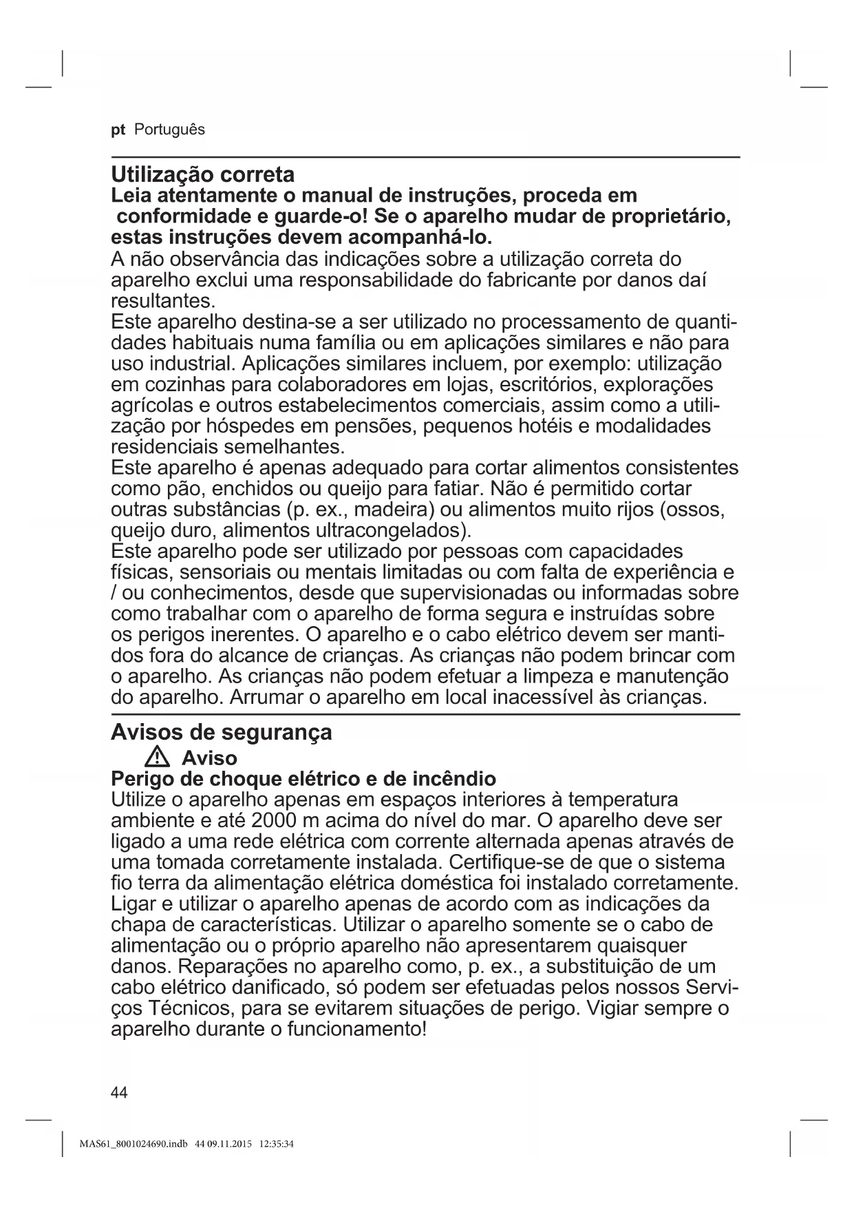 Eliminaraembalagemdeforma ecológica.Esteaparelhoestá marcadoemconformidadecoma Directiva2012/19/UErelativaaos resíduosdeequipamentoseléctricos eelectrónicos(wasteelectricaland electronicequipment–WEEE). Adirectivaestabeleceoquadropara acriaçãodeumsistemaderecolha evalorizaçãodosequipamentos usadosválidoemtodososEstados MembrosdaUniãoEuropeia. Contactarorevendedorespecializado paramaisinformações. Garantia Paraesteaparelhovigoramascondições degarantiapublicadaspelonossorepre- sentantenopaísemqueomesmofor adquirido.Orepresentanteondecomprou oaparelhopoderádar-lhemaispormenores sobreesteassunto.Paraaprestaçãode qualquerserviçodentrodagarantiaé, noentanto,necessáriaaapresentaçãodo documentodecompradoaparelho. Salvoalteraçõestécnicas. MAS61_8001024690.indb 47 09.11.2015 12:35:3448