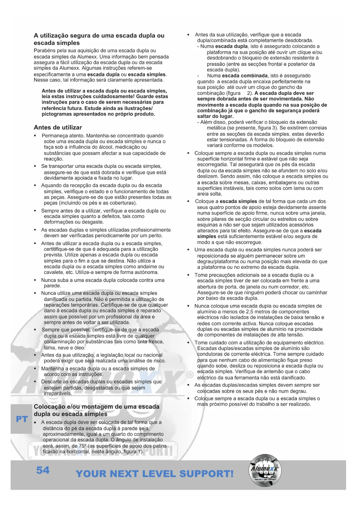 Parabéns pela sua aquisicao de uma escada dupla ou escada simples da Alumexx. Uma informacao bem pensada assegura a fácil uso da escada dupla ou da escada simples da Alumexx. Algumas instruções referem-se especificamente a uma escada dupla ou escada simples. Nesse caso, tal informacao sera claramente aparecada.