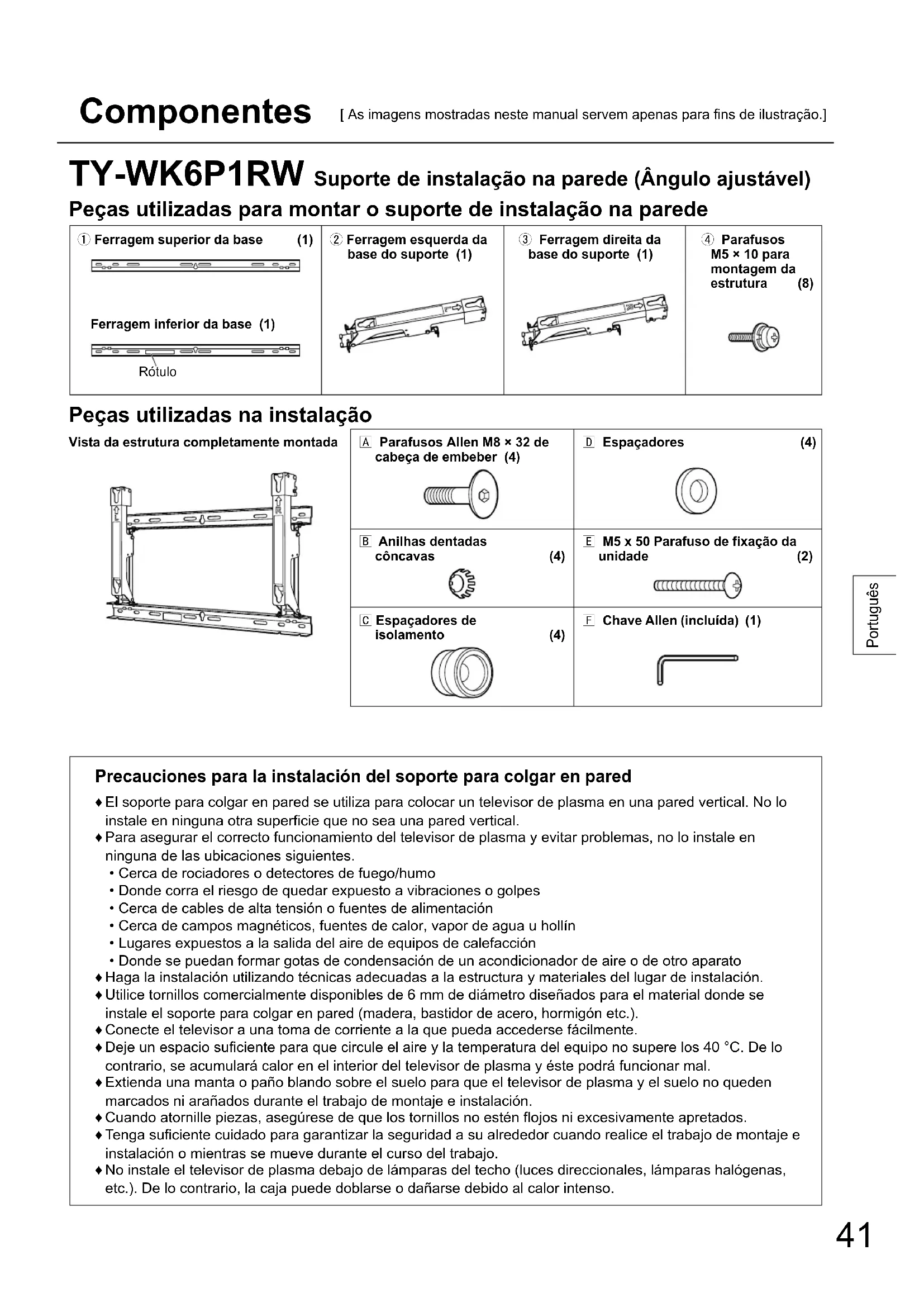 Atenção: Este suporte destina-se apenas aos modelos de televisor com ecrã de plasma da Panasonic (Consulte a página 45). A utilização com outros aparelhos pode causar instabilidade e ferir alguém. A INSTALAÇÃO TEM DE SER FEITA POR UM PROFISSIONAL. A PANASONIC NÃO SE RESPONSABILIZA POR DANOS MATERIAIS E/OU FERIMENTOS GRAVES, INCLUINDO A MORTE RESULTANTES DE UMA INSTALAÇÃO MAL FEITA OU DE UM MANUSEAMENTO INCORRECTO.41 Português TY-WK6P1RW Suporte de instalação na parede (Ângulo ajustável) Peças utilizadas para montar o suporte de instalação na parede Ferragem superior da base (1) Ferragem esquerda da base do suporte (1) Ferragem direita da base do suporte (1) Parafusos M5 × 10 para montagem da estrutura (8) Ferragem inferior da base (1)Rótulo Peças utilizadas na instalação Vista da estrutura completamente montada Parafusos Allen M8 × 32 de cabeça de embeber (4) Espaçadores (4) Anilhas dentadas côncavas (4) M5 x 50 Parafuso de fixação da unidade (2) Espaçadores de isolamento (4) Chave Allen (incluída) (1) Componentes [ As imagens mostradas neste manual servem apenas para fins de ilustração.] Precauciones para la instalación del soporte para colgar en pared ♦ El soporte para colgar en pared se utiliza para colocar un televisor de plasma en una pared vertical. No lo instale en ninguna otra superficie que no sea una pared vertical. ♦ Para asegurar el correcto funcionamiento del televisor de plasma y evitar problemas, no lo instale en ninguna de las ubicaciones siguientes. • Cerca de rociadores o detectores de fuego/humo • Donde corra el riesgo de quedar expuesto a vibraciones o golpes • Cerca de cables de alta tensión o fuentes de alimentación • Cerca de campos magnéticos, fuentes de calor, vapor de agua u hollín • Lugares expuestos a la salida del aire de equipos de calefacción • Donde se puedan formar gotas de condensación de un acondicionador de aire o de otro aparato ♦ Haga la instalación utilizando técnicas adecuadas a la estructura y materiales del lugar de instalación. ♦ Utilice tornillos comercialmente disponibles de 6 mm de diámetro diseñados para el material donde se instale el soporte para colgar en pared (madera, bastidor de acero, hormigón etc.). ♦ Conecte el televisor a una toma de corriente a la que pueda accederse fácilmente. ♦ Deje un espacio suficiente para que circule el aire y la temperatura del equipo no supere los 40 °C. De lo contrario, se acumulará calor en el interior del televisor de plasma y éste podrá funcionar mal. ♦ Extienda una manta o paño blando sobre el suelo para que el televisor de plasma y el suelo no queden marcados ni arañados durante el trabajo de montaje e instalación. ♦ Cuando atornille piezas, asegúrese de que los tornillos no estén flojos ni excesivamente apretados. ♦ Tenga suficiente cuidado para garantizar la seguridad a su alrededor cuando realice el trabajo de montaje e instalación o mientras se mueve durante el curso del trabajo. ♦ No instale el televisor de plasma debajo de lámparas del techo (luces direccionales, lámparas halógenas, etc.). De lo contrario, la caja puede doblarse o dañarse debido al calor intenso.42 Português Procedimento de montagem [Nunca use qualquer outro método que especificou para instalar.]