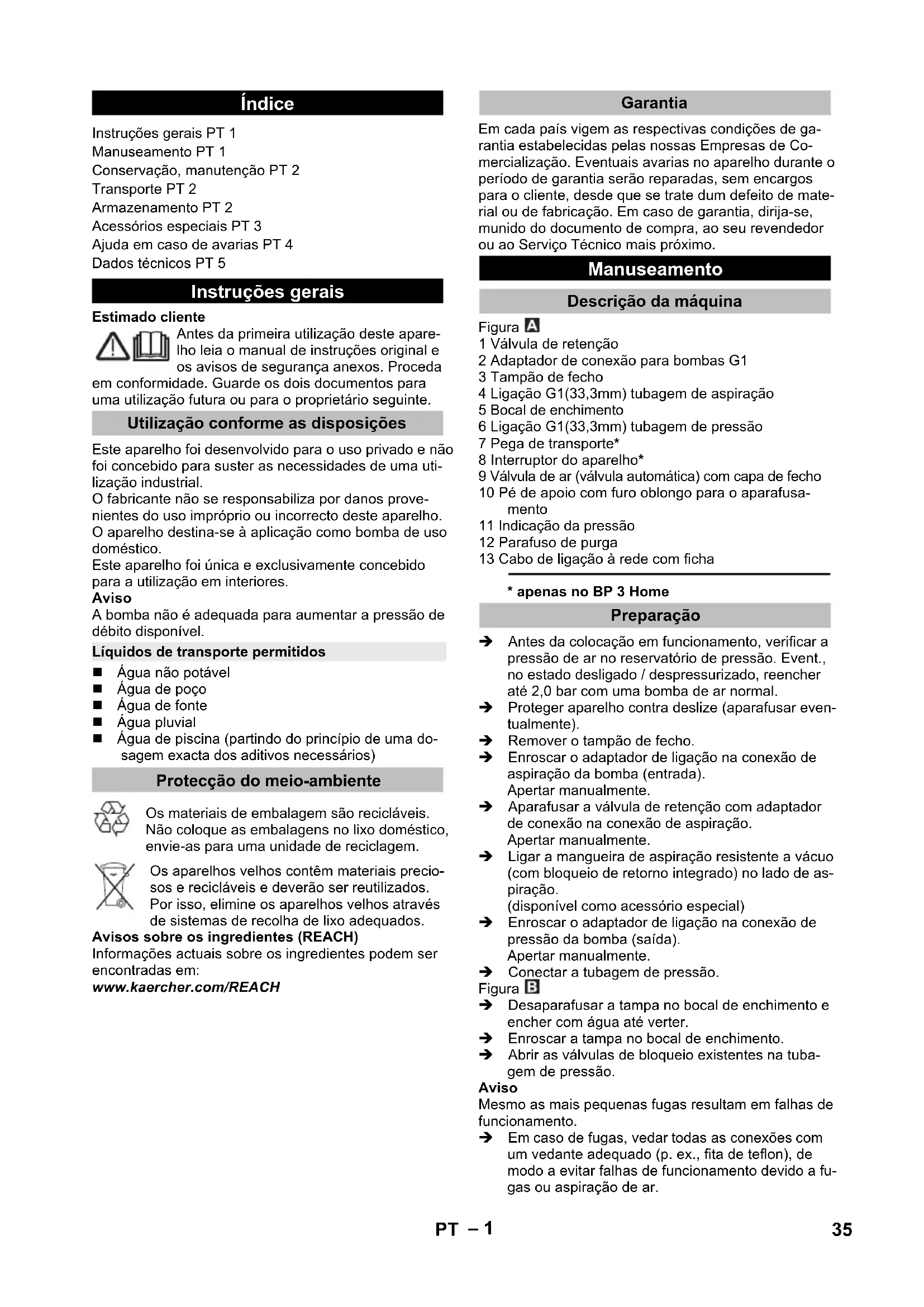 • apenas no BP 3 Home Antes da colocação em funcionamento, verificar a pressão de ar no reservatório de pressão. Event., no estado desligado / despressurizado, reencher até 2,0 bar com uma bomba de ar normal. Proteger aparelho contra deslize (aparafusar even- tualmente). Remover o tampão de fecho. Enroscar o adaptador de ligação na conexão de aspiração da bomba (entrada). Apertar manualmente. Aparafusar a válvula de retenção com adaptador de conexão na conexão de aspiração. Apertar manualmente. Ligar a mangueira de aspiração resistente a vácuo (com bloqueio de retorno integrado) no lado de as- piração. (disponível como acessório especial) Enroscar o adaptador de ligação na conexão de pressão da bomba (saída). Apertar manualmente. Conectar a tubagem de pressão. Figura Desaparafusar a tampa no bocal de enchimento e encher com água até verter. Enroscar a tampa no bocal de enchimento. Abrir as válvulas de bloqueio existentes na tuba- gem de pressão. Aviso Mesmo as mais pequenas fugas resultam em falhas de funcionamento. Em caso de fugas, vedar todas as conexões com um vedante adequado (p. ex., fita de teflon), de modo a evitar falhas de funcionamento devido a fu- gas ou aspiração de ar. Índice Instruções gerais PT 1 Manuseamento PT 1 Conservação, manutenção PT 2 Transporte PT 2 Armazenamento PT 2 Acessórios especiais PT 3 Ajuda em caso de avarias PT 4 Dados técnicos PT 5 Instruções gerais Utilização conforme as disposições Líquidos de transporte permitidos Protecção do meio-ambiente Garantia Manuseamento Descrição da máquina Preparação 35PT– 2 Em caso de uma instalação fixa, a bomba pode ser apa- rafusada numa superfície adequada. Aparafusar os pés de apoio com parafusos ade- quados numa superfície plana. Adicionalmente é aconselhada a montagem de um componente flexível do lado de pressão como, por exemplo, uma mangueira de compensação da pressão flexível (ver acessórios especiais), em caso de uma ins- talação fixa. Esta tem as seguintes vantagens: Maior flexibilidade durante a instalação e montagem. Redução do ruído, visto não serem transmitidas vi- brações para os tubos. A bomba liga e desliga com menor frequência em caso de pequenas fugas. Aviso De modo a facilitar o esvaziamento posterior e o des- carregamento da pressão do sistema recomendamos a montagem de uma torneira de paragem entre a bomba e a mangueira de pressão. (não incluído no volume de fornecimento) Durante o esvaziamento da bomba é possível evitar o escoamento da água da mangueira de pressão através da torneira de paragem. BP 3 Home: Ligue a ficha de rede à tomada de corrente. Ligar o aparelho no interruptor do aparelho. BP 5 Home: Ligue a ficha de rede à tomada de corrente. Aviso A bomba arranca imediatamente. Aguardar até a bom- ba aspirar e transportar a água univormemente e fechar posteriormente as válvulas de retenção da tubagem de pressão. O interruptor manométrico desliga o motor as- sim que a pressão de desactivação for atingida. O re- servatório de pressão está agora cheio, a bomba de uso doméstico está operacional. Em caso de falta de alimentação da água, a pressão de desactivação não é atingida, o pressóstato não conse- gue desligar o aparelho. Desta forma, a água na cabeça da bomba aquece. Para evitar danos na bomba devido a um sobreaqueci- mento, em caso de sobreaquecimento a alimentação eléctrica é interrompida através do interruptor térmico. A alimentação eléctrica é restabelecida após o arrefeci- mento. Aviso O tempo de arrefecimento até ao rearranque do motor pode ser de até 150 min. Para garantir a protecção contra situações de falta de água, recomendamos a utilização de uma protecção contra o funcionamento a seco (ver "Acessórios espe- ciais"). ATENÇÃO O sistema está sob pressão! (Consulte a pressão no capítulo dos dados técnicos) BP 3 Home: Desligar o aparelho no interruptor do aparelho. Puxar a ficha de rede da tomada. BP 5 Home: Puxar a ficha de rede da tomada. PERIGO Antes de efectuar trabalhos de conservação e de ma- nutenção desligar o aparelho e retirar a ficha de rede. Abrir a válvula de retenção para aliviar a pressão e vol- tar a fechar. O sistema está sem pressão. limpar a bomba com água limpa sempre que esta for utilizada para transportar água com aditivos. Controlar semestralmente a pressão do ar no re- servatório de pressão. Eventualmente, no estado desligado / despressurizado, reencher até 2,0 bar (desencaixar o aparelho, abrir a torneira da água). Figura A válvula de ar encontra-se por baixo da cobertura. Ro- dar a cobertura no sentido contrário ao dos ponteiros do relógio. 몇 CUIDADO De modo a evitar acidentes ou ferimentos durante o transporte, deve ter-se atenção ao peso do aparelho (ver dados técnicos). Proteger o aparelho contra deslizamentos e tom- bamentos. 몇 CUIDADO De modo a evitar acidentes ou ferimentos durante a se- lecção do local de armazenamento, deve ter-se em consideração o peso do aparelho (ver dados técnicos). Esvaziar o aparelho completamente antes de o ar- mazenar. Guardar a máquina num local ao abrigo do gelo. Instalação fixa Funcionamento Desligar o aparelho Conservação, manutenção Conservação Manutenção Transporte Transporte em veículos Armazenamento Guardar a máquina 36 PT– 3 Acessórios especiais As figuras dos acessórios especiais mencionados a seguir são indicadas na página 4 destas instruções. 6.997-343.0 Pré-filtro da bomba, peque- no (débito até 4000 l/h) Pré-filtro da bomba para todas as bombas convencionais sem filtro integrado. Para a protecção das bombas contra grandes partículas de sujidade ou areia. O filtro fino é lavável. Para bombas com rosca de conexão G1 (33,3 mm). 6.997-344.0 Pré-filtro da bomba, grande (débito até 6000 l/h) Pré-filtro da bomba para todas as bombas convencionais sem filtro integrado. Para a protecção das bombas
