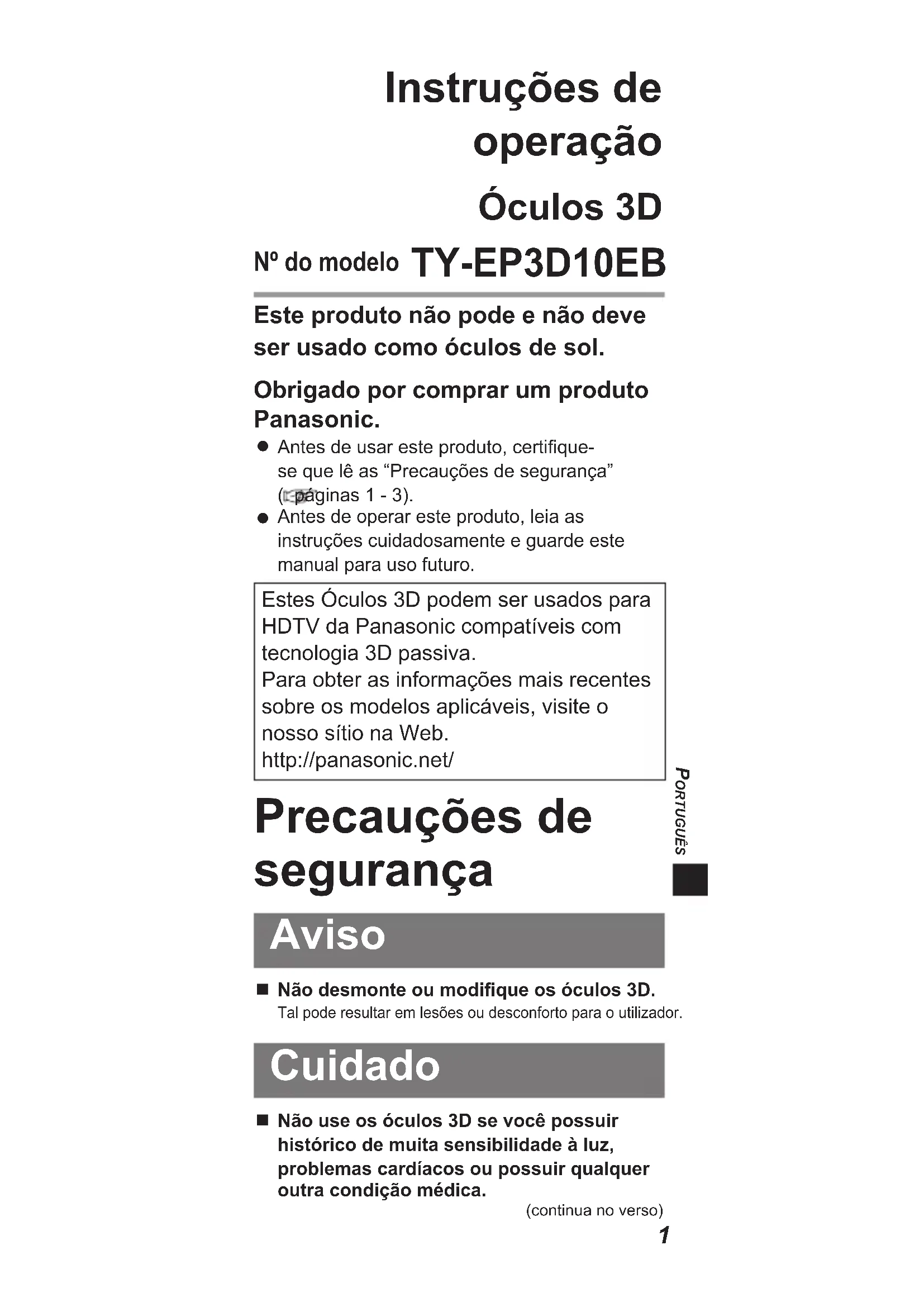 Antes de operar este produto, leia as instruções cuidadosamente e guarde este manual para uso futuro.Estes Óculos 3D podem ser usados para HDTV da Panasonic compatíveis com tecnologia 3D passiva.Para obter as informações mais recentes sobre os modelos aplicáveis, visite o nosso sítio na Web.http://panasonic.net/ Precauções de segurança Aviso