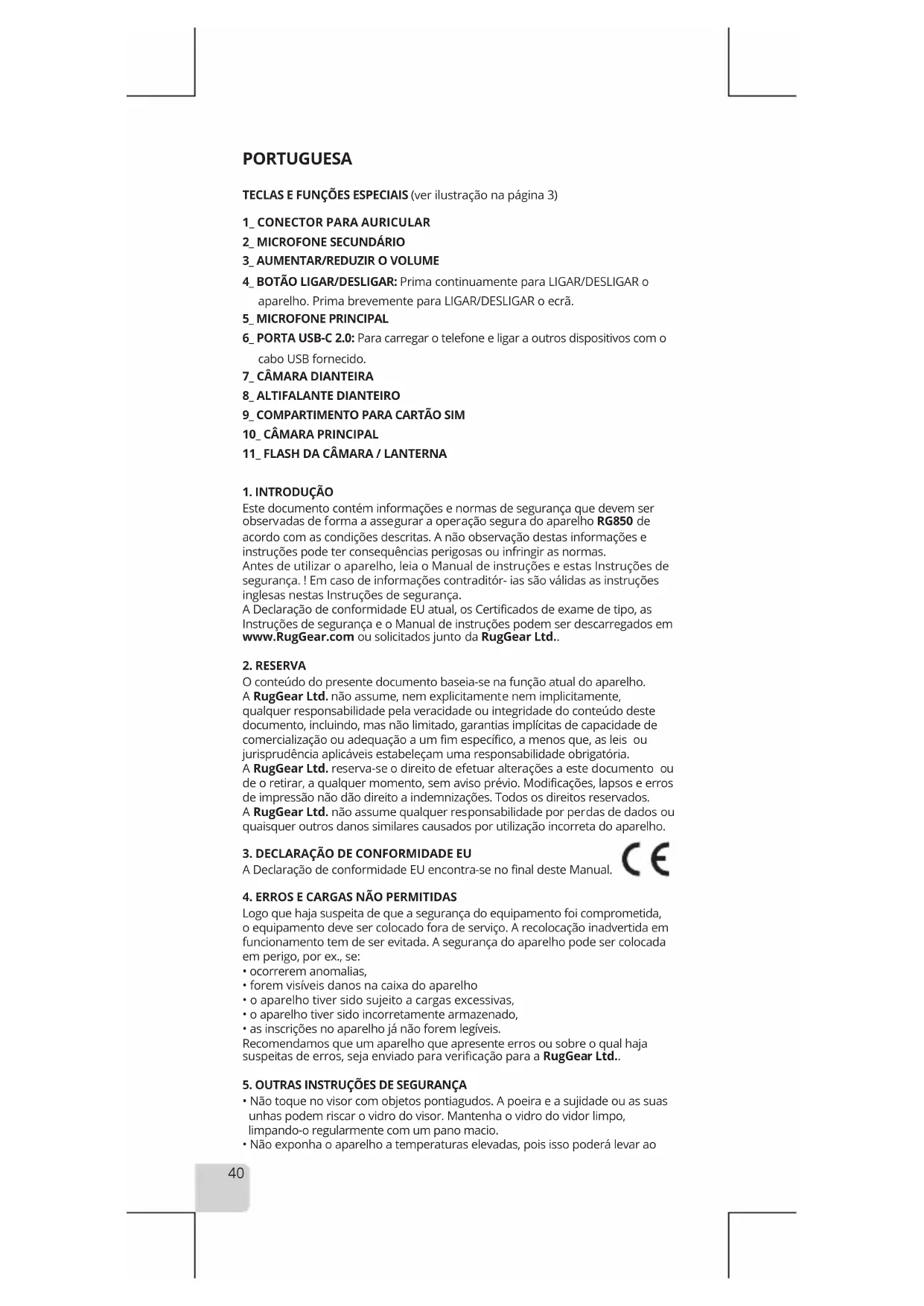 Este documento contém informações e normas de segurança que devem ser observadas de forma a assegurar a operação segura do aparelho RG850 de acordo com as condições descritas. A não observação destas informações e instruções pode ter consequências perigosas ou infringir as normas. Antes de utilizar o aparelho, leia o Manual de instruções e estas Instruções de segurança. ! Em caso de informações contraditór- ias são válidas as instruções inglesas nestas Instruções de segurança. A Declaração de conformidade EU atual, os Certificados de exame de tipo, as Instruções de segurança e o Manual de instruções podem ser descarregados em www.RugGear.com ou solicitados junto da RugGear Ltd..
