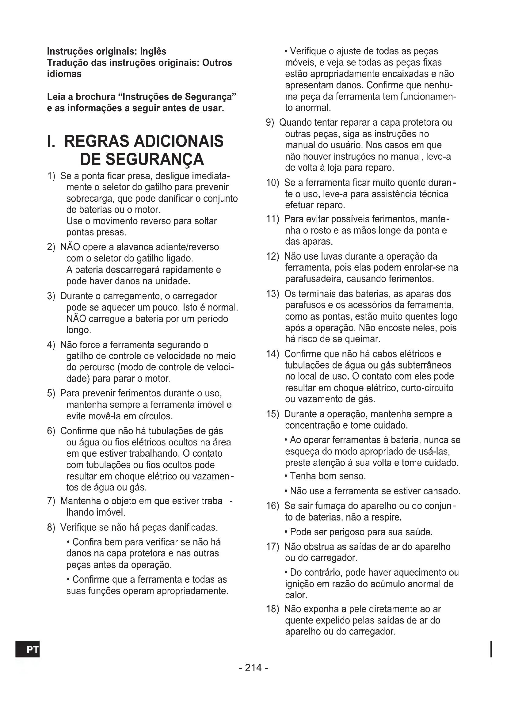 - Ao operar ferramentas à bateria, nunca se esqueça do modo apropriado de usá-las, preste atenção à sua volta e tome cuidado.