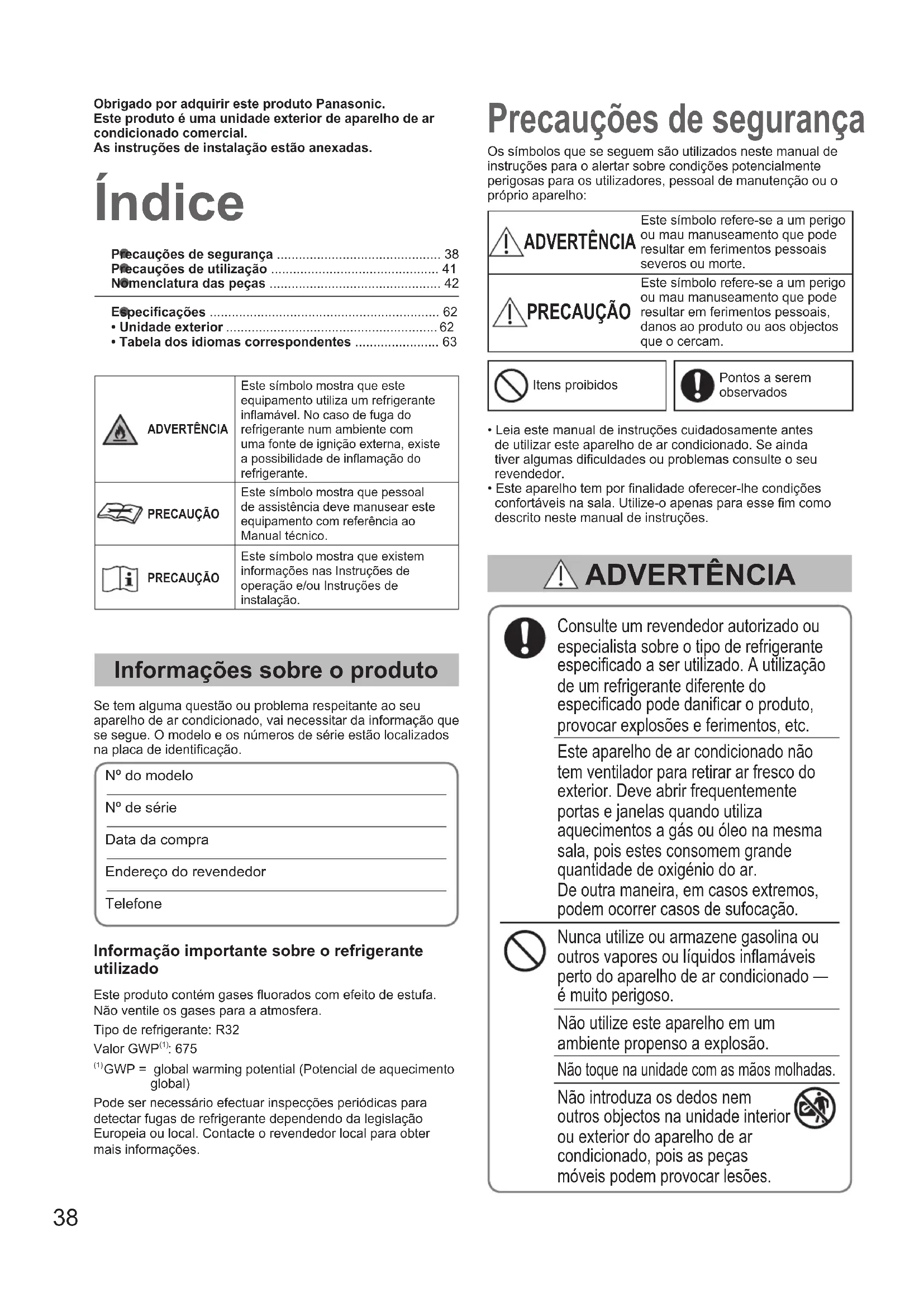- Tabela dos idiomas correspondentes ....................... 63 Índice Precauções de segurança Informações sobre o produto Se tem alguma questão ou problema respeitante ao seu aparelho de ar condicionado, vai necessitar da informação que se segue. O modelo e os números de série estão localizados na placa de identicação.Nº do modelo Nº de série Data da compraEndereço do revendedorTelefoneConsulte um revendedor autorizado ou especialista sobre o tipo de refrigerante especicado a ser utilizado. A utilização de um refrigerante diferente do especicado pode danicar o produto, provocar explosões e ferimentos, etc.Este aparelho de ar condicionado não tem ventilador para retirar ar fresco do exterior. Deve abrir frequentemente portas e janelas quando utiliza aquecimentos a gás ou óleo na mesma sala, pois estes consomem grande quantidade de oxigénio do ar. De outra maneira, em casos extremos, podem ocorrer casos de sufocação.Nunca utilize ou armazene gasolina ou outros vapores ou líquidos inamáveis perto do aparelho de ar condicionado — é muito perigoso.Não utilize este aparelho em um ambiente propenso a explosão.Não toque na unidade com as mãos molhadas.Não introduza os dedos nem outros objectos na unidade interior ou exterior do aparelho de ar condicionado, pois as peças móveis podem provocar lesões.Os símbolos que se seguem são utilizados neste manual de instruções para o alertar sobre condições potencialmente perigosas para os utilizadores, pessoal de manutenção ou o próprio aparelho: ADVERTÊNCIA Este símbolo refere-se a um perigo ou mau manuseamento que pode resultar em ferimentos pessoais severos ou morte. PRECAUÇÃO Este símbolo refere-se a um perigo ou mau manuseamento que pode resultar em ferimentos pessoais, danos ao produto ou aos objectos que o cercam.Itens proibidosPontos a serem observados• Leia este manual de instruções cuidadosamente antes de utilizar este aparelho de ar condicionado. Se ainda tiver algumas diculdades ou problemas consulte o seu revendedor.• Este aparelho tem por nalidade oferecer-lhe condições confortáveis na sala. Utilize-o apenas para esse m como descrito neste manual de instruções. ADVERTÊNCIA Obrigado por adquirir este produto Panasonic.Este produto é uma unidade exterior de aparelho de ar condicionado comercial.As instruções de instalação estão anexadas.ADVERTÊNCIAEste símbolo mostra que este equipamento utiliza um refrigerante inamável. No caso de fuga do refrigerante num ambiente com uma fonte de ignição externa, existe a possibilidade de inamação do refrigerante.PRECAUÇÃOEste símbolo mostra que pessoal de assistência deve manusear este equipamento com referência ao Manual técnico.PRECAUÇÃOEste símbolo mostra que existem informações nas Instruções de operação e/ou Instruções de instalação.Informação importante sobre o refrigerante utilizadoEste produto contém gases uorados com efeito de estufa. Não ventile os gases para a atmosfera.Tipo de refrigerante: R32Valor GWP (1) : 675 (1) GWP = global warming potential (Potencial de aquecimento global)Pode ser necessário efectuar inspecções periódicas para detectar fugas de refrigerante dependendo da legislação Europeia ou local. Contacte o revendedor local para obter mais informações. OI_00_302355_all.indb 38 2018/9/20 10:01:4039 PORTUGUÊS ADVERTÊNCIA Se o refrigerante entrar em contacto com uma chama, ele produzirá um gás tóxico. Por razões de segurança, certique- se de que desliga o aparelho de ar condicionado e a corrente eléctrica antes da limpeza ou da assistência. Em caso de emergência, desligue a cha eléctrica da tomada ou desligue o disjuntor ou o interruptor eléctrico para isolar o aparelho de ar condicionado da fonte de alimentação. Elimine de acordo com a legislação nacional e/ou local. Este produto não deve ser modicado ou desmontado em nenhuma hipótese. Uma unidade desmontada ou modicada pode causar incêndio, choque eléctrico ou ferimento. Os utilizadores não devem limpar o interior das unidades exteriores e interiores. A limpeza deve ser realizada por um especialista ou um revendedor autorizado. Em caso de avaria deste aparelho, não o repare sozinho. Entre em contacto com o distribuidor ou o representante de assistência para efectuar uma reparação e eliminação. De modo a evitar o sobreaquecimento e incêndios, não utilize cabos modicados, cabos partilhados, extensões eléctricas nem cabos não especicados. Providencie uma tomada eléctrica para ser utilizada exclusivamente para cada unidade, bem como um interruptor para a fonte de energia, um disjuntor de fugas de ligação à terra (ELCB) ou um dispositivo de corrente residual (RCD) para protecção de sobrecorrente na linha exclusiva. Providencie uma tomada eléctrica exclusivamente para cada unidade e integrar meios de desactivação total com separação de contacto em todos os pólos da instalação eléctrica xa, conforme as normas de ação. Para impedir possíveis perigos devido a falha do isolamento, tem de ligar a unidade à massa. O aparelho deve ser armazenado em uma sala sem fontes de ignição em funcionamento contínuo (por exemplo: chamas abertas, aparelho de gás em funcionamento ou um aquecedor eléctrico em funcionamento). Tenha em mente que os refrigerantes podem ser inodoros. Uma área sem ventilação, na qual seja instalado um aparelho que utilize refrigerantes inamáveis, deve ser construída de forma que qualquer fuga do refrigerante não que connada no ambiente, pois isso criaria um perigo de incêndio ou explosão. O aparelho deverá ser armazenado em uma área bem ventilada em que o tamanho da sala corresponda à área da sala conforme especicado para o funcionamento. Depois de instalar a unidade, certique- se de que pergunta ao instalador sobre o espaço do piso da sala onde a unidade está instalada e sobre a quantidade de carga do refrigerante. No caso de mudança da unidade ou de um d