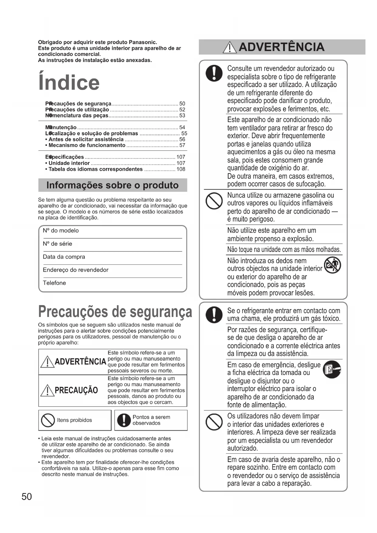 - Tabela dos idiomas correspondentes ..................... 108 Índice Precauções de segurança Informações sobre o produto Se tem alguma questão ou problema respeitante ao seu aparelho de ar condicionado, vai necessitar da informação que se segue. O modelo e os números de série estão localizados na placa de identicação.Nº do modelo Nº de série Data da compraEndereço do revendedorTelefoneConsulte um revendedor autorizado ou especialista sobre o tipo de refrigerante especicado a ser utilizado. A utilização de um refrigerante diferente do especicado pode danicar o produto, provocar explosões e ferimentos, etc.Este aparelho de ar condicionado não tem ventilador para retirar ar fresco do exterior. Deve abrir frequentemente portas e janelas quando utiliza aquecimentos a gás ou óleo na mesma sala, pois estes consomem grande quantidade de oxigénio do ar. De outra maneira, em casos extremos, podem ocorrer casos de sufocação.Nunca utilize ou armazene gasolina ou outros vapores ou líquidos inamáveis perto do aparelho de ar condicionado — é muito perigoso.Não utilize este aparelho em um ambiente propenso a explosão.Não toque na unidade com as mãos molhadas.Não introduza os dedos nem outros objectos na unidade interior ou exterior do aparelho de ar condicionado, pois as peças móveis podem provocar lesões.Se o refrigerante entrar em contacto com uma chama, ele produzirá um gás tóxico.Por razões de segurança, certique-se de que desliga o aparelho de ar condicionado e a corrente eléctrica antes da limpeza ou da assistência.Em caso de emergência, desligue a cha eléctrica da tomada ou desligue o disjuntor ou o interruptor eléctrico para isolar o aparelho de ar condicionado da fonte de alimentação.Os utilizadores não devem limpar o interior das unidades exteriores e interiores. A limpeza deve ser realizada por um especialista ou um revendedor autorizado.Em caso de avaria deste aparelho, não o repare sozinho. Entre em contacto com o revendedor ou o serviço de assistência para levar a cabo a reparação.Os símbolos que se seguem são utilizados neste manual de instruções para o alertar sobre condições potencialmente perigosas para os utilizadores, pessoal de manutenção ou o próprio aparelho: ADVERTÊNCIA Este símbolo refere-se a um perigo ou mau manuseamento que pode resultar em ferimentos pessoais severos ou morte. PRECAUÇÃO Este símbolo refere-se a um perigo ou mau manuseamento que pode resultar em ferimentos pessoais, danos ao produto ou aos objectos que o cercam.Itens proibidosPontos a serem observados• Leia este manual de instruções cuidadosamente antes de utilizar este aparelho de ar condicionado. Se ainda tiver algumas diculdades ou problemas consulte o seu revendedor.• Este aparelho tem por nalidade oferecer-lhe condições confortáveis na sala. Utilize-o apenas para esse m como descrito neste manual de instruções.Obrigado por adquirir este produto Panasonic.Este produto é uma unidade interior para aparelho de ar condicionado comercial.As instruções de instalação estão anexadas. ADVERTÊNCIA OI_00_291492_EU.indb 50 2017/6/20 10:47:2451 PORTUGUÊS Este equipamento pretende ser usado por peritos ou utilizadores com formação em lojas, na indústria leve e em quintas, ou para utilização comercial por pessoas não especializadas. Este aparelho pode ser utilizado por crianças acima de 8 anos de idade e por pessoas com deciências físicas, sensoriais ou mentais, ou com falta de experiência e conhecimento, desde que sejam supervisionados ou instruídos sobre a utilização do aparelho de maneira segura e desde que compreendam os perigos envolvidos. Crianças não devem brincar com o aparelho. A limpeza e manutenção pelo utilizador não devem ser realizadas por crianças sem supervisão. Mantenha o alarme de incêndio e a saída de ar a pelo menos 1,5 m da unidade. Não arrefeça ou aqueça demasiado a sala quando estiverem presentes bebés ou pessoas inválidas. Não ligue e desligue o aparelho de ar condicionado utilizando o interruptor principal. Utilize o botão de operação ON/OFF. Não coloque nada na saída de ar da unidade exterior. É muito perigoso devido à alta velocidade de rotação do ventilador. Não toque na entrada de ar ou nas pás de alumínio aadas da unidade exterior. Pode sofrer ferimentos. Não cole nenhum objecto na CAIXA DA VENTOINHA. Pode sofrer ferimentos e danicar a unidade. Providencie uma tomada eléctrica para ser utilizada exclusivamente para cada unidade, bem como um interruptor para a fonte de energia, um disjuntor de fugas de ligação à terra (ELCB) ou um dispositivo de corrente residual (RCD) para protecção de sobrecorrente na linha exclusiva. Providencie uma tomada eléctrica exclusivamente para cada unidade e integrar meios de desactivação total com separação de contacto em todos os pólos da instalação eléctrica xa, conforme as normas de ação. Para impedir possíveis perigos devido a falha do isolamento, tem de ligar a unidade à massa. De modo a evitar o sobreaquecimento e incêndios, não utilize cabos modicados, cabos partilhados, extensões eléctricas nem cabos não especicados. Numa situação de anomalia/avaria do produto, interrompa o seu uso e retire a cha da tomada ou e o disjuntor. (Risco de fumo/incêndio/choque eléctrico) Exemplos de anormalidade/avaria: