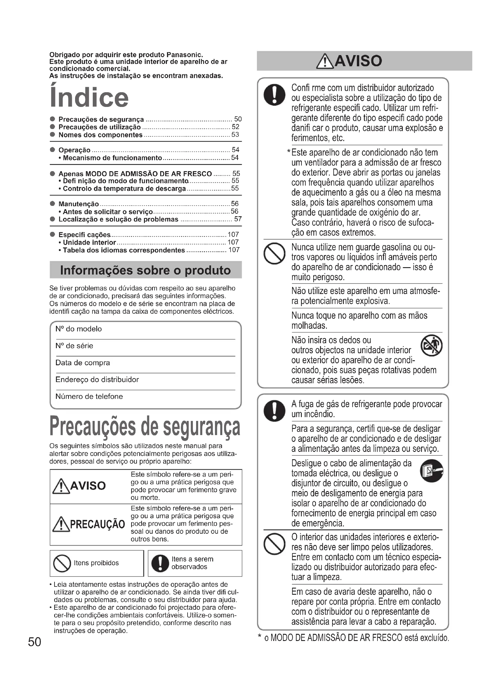 - • Tabela dos idiomas correspondentes Índice Precauções de segurança Informações sobre o produto Se tiver problemas ou dúvidas com respeito ao seu aparelho de ar condicionado, precisará das seguintes informações. Os números do modelo e de série se encontram na placa de identifi cação na tampa da caixa de componentes eléctricos.Nº do modelo Nº de série Data de compraEndereço do distribuidorNúmero de telefone Confi rme com um distribuidor autorizado ou especialista sobre a utilização do tipo de refrigerante especifi cado. Utilizar um refri- gerante diferente do tipo especifi cado pode danifi car o produto, causar uma explosão e ferimentos, etc. Este aparelho de ar condicionado não tem um ventilador para a admissão de ar fresco do exterior. Deve abrir as portas ou janelas com frequência quando utilizar aparelhos de aquecimento a gás ou a óleo na mesma sala, pois tais aparelhos consomem uma grande quantidade de oxigénio do ar. Caso contrário, haverá o risco de sufoca- ção em casos extremos. Nunca utilize nem guarde gasolina ou ou- tros vapores ou líquidos infl amáveis perto do aparelho de ar condicionado — isso é muito perigoso. Não utilize este aparelho em uma atmosfe- ra potencialmente explosiva. Nunca toque no aparelho com as mãos molhadas. Não insira os dedos ou outros objectos na unidade interior ou exterior do aparelho de ar condi- cionado, pois suas peças rotativas podem causar sérias lesões. A fuga de gás de refrigerante pode provocar um incêndio. Para a segurança, certifi que-se de desligar o aparelho de ar condicionado e de desligar a alimentação antes da limpeza ou serviço. Desligue o cabo de alimentação da tomada eléctrica, ou desligue o disjuntor de circuito, ou desligue o meio de desligamento de energia para isolar o aparelho de ar condicionado do fornecimento de energia principal em caso de emergência. O interior das unidades interiores e exterio- res não deve ser limpo pelos utilizadores. Entre em contacto com um técnico especia- lizado ou distribuidor autorizado para efec- tuar a limpeza. Em caso de avaria deste aparelho, não o repare por conta própria. Entre em contacto com o distribuidor ou o representante de assistência para levar a cabo a reparação. Os seguintes símbolos são utilizados neste manual para alertar sobre condições potencialmente perigosas aos utiliza-dores, pessoal de serviço ou próprio aparelho: AVISO Este símbolo refere-se a um peri-go ou a uma prática perigosa que pode provocar um ferimento grave ou morte. PRECAUÇÃO Este símbolo refere-se a um peri-go ou a uma prática perigosa que pode provocar um ferimento pes-soal ou danos do produto ou de outros bens.Itens proibidosItens a serem observadosObrigado por adquirir este produto Panasonic.Este produto é uma unidade interior de aparelho de ar condicionado comercial.As instruções de instalação se encontram anexadas.• Leia atentamente estas instruções de operação antes de utilizar o aparelho de ar condicionado. Se ainda tiver difi cul-dades ou problemas, consulte o seu distribuidor para ajuda.• Este aparelho de ar condicionado foi projectado para ofere-cer-lhe condições ambientais confortáveis. Utilize-o somen-te para o seu propósito pretendido, conforme descrito nas instruções de operação. AVISO p. 107