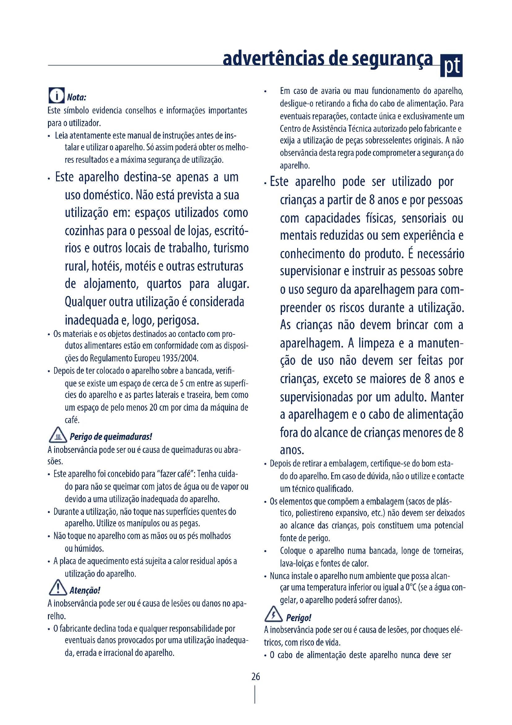 - Este aparelho pode ser utilizado por crianças a partir de 8 anos e por pessoas com capacidades físicas, sensoriais ou mentais reduzidas ou sem experiência e conhecimento do produto. É necessário supervisionar e instruir as pessoas sobre o uso seguro da aparelhagem para com- preender os riscos durante a utilização. As crianças não devem brincar com a aparelhagem. A limpeza e a manuten- ção de uso não devem ser feitas por crianças, exceto se maiores de 8 anos e supervisionadas por um adulto. Manter a aparelhagem e o cabo de alimentação fora do alcance de crianças menores de 8 anos.