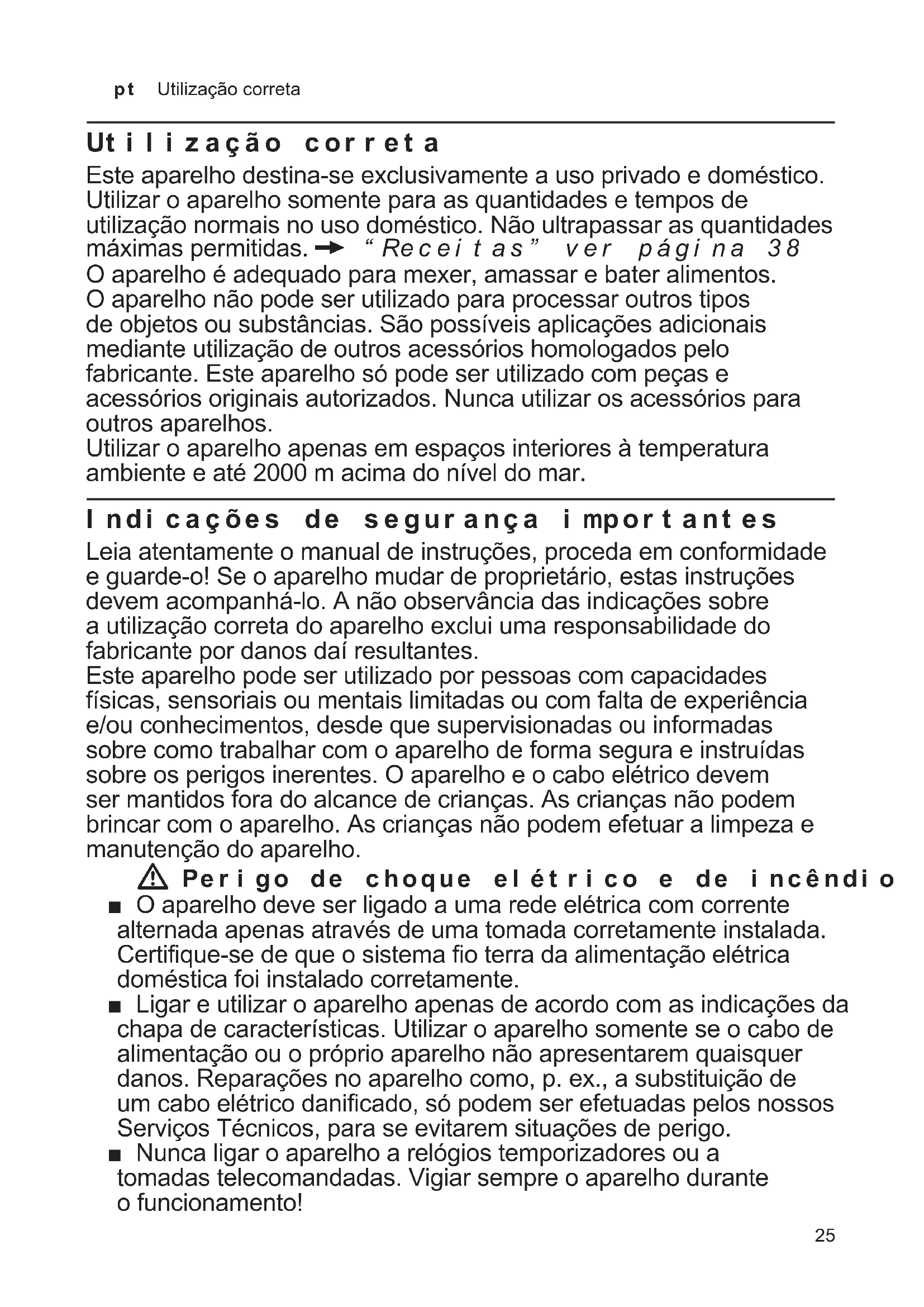 mento amarelo com abertura de saída, por exemplo, dispositivo para cortar e ralar. Importante: ■ Respeitar as marcações amarelas, vermelhas ou pretas existentes no acionamento e nos acessórios. X “Marcações de cor” ver página 28 ■ Cobrir os acionamentos não utilizados sempre com as respetivas tampas de proteção. ■ Consultar os restantes passos nas instruções do respetivo acessório, fornecidas em separado. Limpeza e conservação O aparelho e as ferramentas utilizadas têm de ser bem limpos após cada utilização. X Fig. N W Perigo de choque elétrico! – Antes da limpeza, desligar a ficha da tomada. – Nunca mergulhar o aparelho base em líquidos nem lavá-lo na máquina de lavar loiça. – Nunca utilizar aparelhos de limpeza a vapor.38 pt Receitas Atenção! – Não utilizar detergentes que contenham álcool ou álcool etílico. – Não utilizar objetos cortantes, pontiagudos ou metálicos. – Não utilizar panos ou detergentes abrasivos. – Não entalar as peças de plástico dentro da máquina, pois podem verificar-se ligeiras deformações! Limpar o aparelho base ■ Retirar a tampa de proteção do acionamento. ■ Limpar o aparelho base e a tampa de proteção do acionamento com um pano macio humedecido e, em seguida, secar. Limpeza da tigela e das ferramentas ■ Lavar a tigela, a tampa e as ferramentas com uma solução à base de detergente e um pano macio ou uma esponja ou lavá-los na máquina de lavar loiça. ■ Deixar secar bem todas as peças. Receitas Natas batidas – 200-1500 g ■ Bater as natas 1½ a 4 minutos na fase 7, dependendo da quantidade e das características das natas, com a vara para claras em castelo “Profi”. Nota: Nos modelos com SensorControl Plus utilizar o programa automático. X “Utiliza- ção do SensorControl Plus” ver página 34 Claras – 2-12 claras ■ Bater as claras 4 a 6 minutos na fase 7 com a vara para claras em castelo “Profi”. Nota: Nos modelos com SensorControl Plus utilizar o programa automático. X “Utiliza- ção do SensorControl Plus” ver página 34 Massa de pão de ló Receita base – 3 ovos – 3-4 colheres de sopa de água quente – 150 g de açúcar – 1 pacote de açúcar baunilhado – 150 g de farinha – 50 g de fécula – Um pouco de fermento em pó ■ Bater os ingredientes (exceto a farinha e a fécula) com a vara para claras em castelo “Profi” na fase 7, durante ca. de 4-6 minutos, até formar espuma. ■ Rodar o seletor para a fase 1, adicionar e misturar, colher a colher, a farinha peneirada e a fécula durante ca. de ½ até 1 minuto. Quantidade máxima: 2 x a receita base Massas leves Receita base – 3-4 ovos – 200-250 g de açúcar – 1 pitada de sal – 1 pacotinho de açúcar baunilhado ou a casca de ½ limão – 200-250 g de manteiga ou margarina (à temperatura ambiente) – 500 g de farinha – 1 pacote de fermento em pó – 150 ml de leite ■ Com a vara para massas leves “Profi Flexi”, misturar todos os ingredientes ca. de ½ minuto na fase 2 e, depois, mais ca. de 2-3 minutos na fase 7. Quantidade máxima: 2½ x a receita base Massa quebrada Receita base – 125 g de manteiga (à temperatura ambiente) – 100-125 g de açúcar – 1 ovo – 1 pitada de sal – Um pouco de casca de limão ou açúcar baunilhado – 250 g de farinha – Um pouco de fermento em pó39 pt Regulação de precisão das ferramentas ■ Com a vara para massas leves “Profi Flexi”, misturar todos os ingredientes durante ca. de ½ minuto na fase 2 e, depois, mais 2-3 minutos na fase 6. A partir de 500 g de farinha: ■ Com a vara para massas pesadas, amassar durante ca. de ½ minuto na fase 1 e, depois, 3-4 minutos na fase 3. Quantidade máxima: 4 x a receita base Massa lêveda Receita base – 500 g de farinha – 1 ovo – 80 g de gordura (à temperatura ambiente) – 80 g de açúcar – 200–250 ml de leite morno – 25 g de fermento fresco ou um pacotinho de fermento seco – Raspa de casca de ½ limão – 1 pitada de sal ■ Amassar todos os ingredientes durante ca. de ½ minuto na fase 1 e, depois, amassar todos os ingredientes com a vara para massas pesadas, durante 3 a 6 minutos, na fase 3. Quantidade máxima: 3 x a receita base Nota: Nos modelos com SensorControl Plus utilizar o programa automático. X “Utilização do SensorControl Plus” ver página 34 Massa batida Receita base – 500 g de farinha – 250 g de ovos (ca. de 5 ovos) – Se necessário, juntar 2-3 colheres de sopa (20-30 g) de água fria ■ Trabalhar todos os ingredientes ca. de 3 a 5 minutos na fase 3 até formar uma massa. Quantidade máxima: 1,5 x a receita base Massa de pão Receita base – 1000 g de farinha – 3 pacotes de levedura seca – 2 colheres de chá de sal – 660 ml de água quente ■ Amassar todos os ingredientes durante ca. de ½ minuto na fase 1 e, depois, amassar todos os ingredientes com a vara para massas pesadas, durante 4 a 5 minutos, na fase 3. Quantidade máxima: 1,5 x a receita base Regulação de precisão das ferramentas W Perigo de ferimentos! Antes de efetuar a regulação de precisão das ferramentas, desligar a ficha da tomada. Atenção! Efetuar a regulação de precisão das ferramentas apenas gradualmente. O braço móvel deve poder baixar-se completamente e as ferramentas não devem encravar no fundo nem na borda da tigela. A distância ideal das ferramentas à tigela é de 3 mm. X Sequência de imagens O ■ Com a vara para claras em castelo “Profi” montada, verificar a regulação atual. ■ Acionar a tecla de desbloqueamento e levantar o braço móvel até travar. ■ Segurar a ferramenta com uma das mãos. Soltar a contraporca com uma chave de bocas (10 mm) no sentido dos ponteiros do relógio. ■ Regular a distância à tigela rodando a ferramenta (uma volta completa corres- ponde a 1 mm de regulação em altura). Rodar no sentido contrário ao dos ponteiros do relógio: Reduz a distância à tigela. Rodar no sentido dos ponteiros do rel