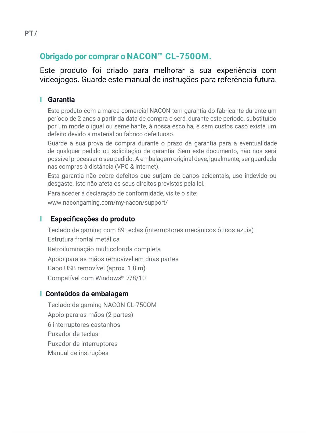 7/8/10 son marcas registradas de Microsoft Corporation.PT / Obrigado por comprar o NACON™ CL-750OM. Este produto foi criado para melhorar a sua experiência com videojogos. Guarde este manual de instruções para referência futura. I Garantia Este produto com a marca comercial NACON tem garantia do fabricante durante um período de 2 anos a partir da data de compra e será, durante este período, substituído por um modelo igual ou semelhante, à nossa escolha, e sem custos caso exista um defeito devido a material ou fabrico defeituoso. Guarde a sua prova de compra durante o prazo da garantia para a eventualidade de qualquer pedido ou solicitação de garantia. Sem este documento, não nos será possível processar o seu pedido. A embalagem original deve, igualmente, ser guardada nas compras à distância (VPC & Internet). Esta garantia não cobre defeitos que surjam de danos acidentais, uso indevido ou desgaste. Isto não afeta os seus direitos previstos pela lei. Para aceder à declaração de conformidade, visite o site: www.nacongaming.com/my-nacon/support/ I Especicaçõesdoproduto Teclado de gaming com 89 teclas (interruptores mecânicos óticos azuis) Estrutura frontal metálica Retroiluminação multicolorida completa Apoio para as mãos removível em duas partes Cabo USB removível (aprox. 1,8 m) Compatível com Windows