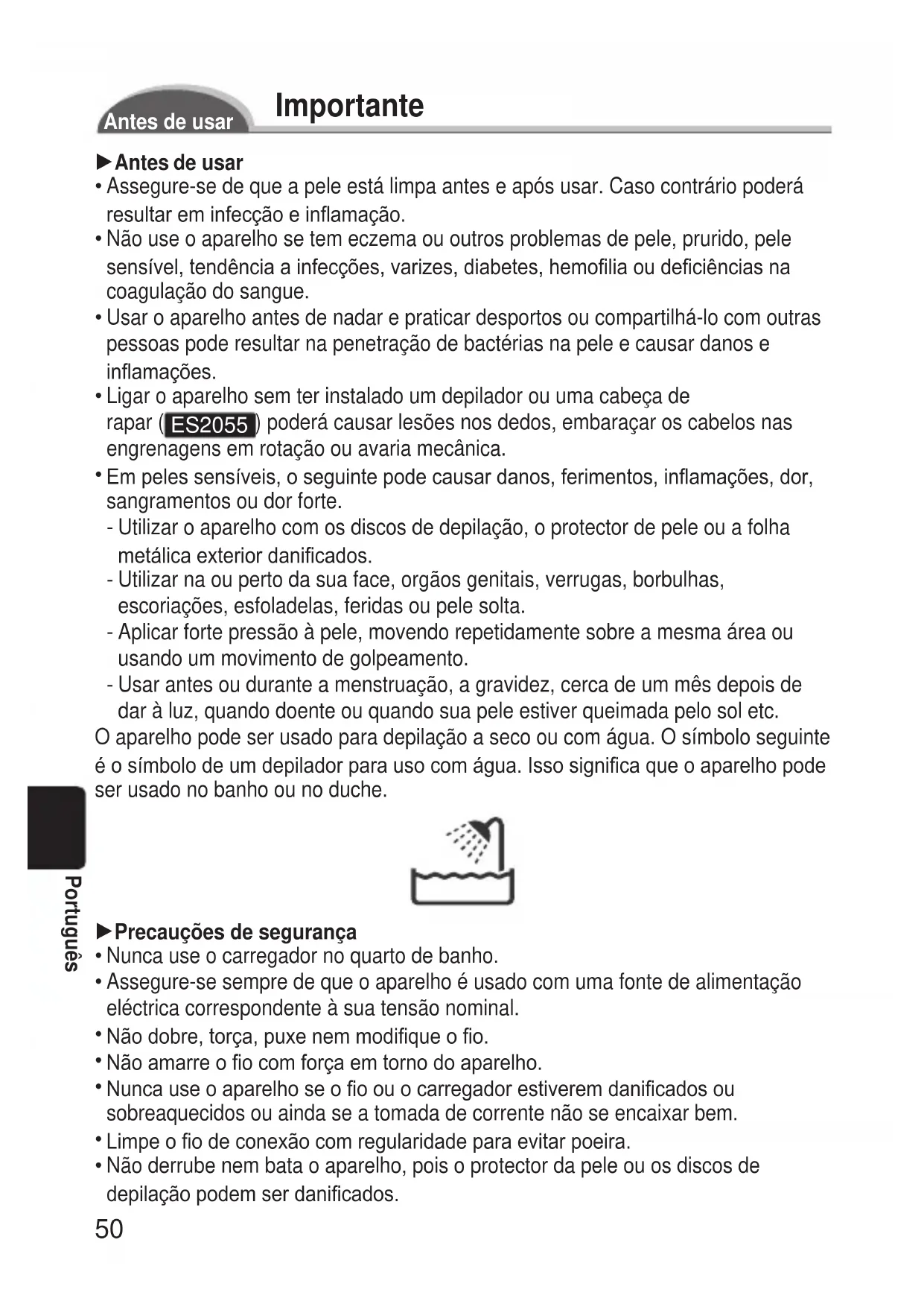 Ontgrendelingsknop van opzetstuk Accessoires: Lader (RE7- 44), reinigingsborsteltje en opbergtasje (Gebruik uitsluitend de meegeleverde accessoires.)50 Português Importante Antes de usar 1Antes de usar Assegure-se de que a pele está limpa antes e após usar. Caso contrário poderá resultar em infecção e inamação. Não use o aparelho se tem eczema ou outros problemas de pele, prurido, pele sensível, tendência a infecções, varizes, diabetes, hemolia ou deciências na coagulação do sangue. Usar o aparelho antes de nadar e praticar desportos ou compartilhá-lo com outras pessoas pode resultar na penetração de bactérias na pele e causar danos e inamações. Ligar o aparelho sem ter instalado um depilador ou uma cabeça de rapar ( ES2055 ) poderá causar lesões nos dedos, embaraçar os cabelos nas engrenagens em rotação ou avaria mecânica. Em peles sensíveis, o seguinte pode causar danos, ferimentos, inamações, dor, sangramentos ou dor forte. Utilizar o aparelho com os discos de depilação, o protector de pele ou a folha metálica exterior danicados. Utilizar na ou perto da sua face, orgãos genitais, verrugas, borbulhas, escoriações, esfoladelas, feridas ou pele solta. Aplicar forte pressão à pele, movendo repetidamente sobre a mesma área ou usando um movimento de golpeamento. Usar antes ou durante a menstruação, a gravidez, cerca de um mês depois de dar à luz, quando doente ou quando sua pele estiver queimada pelo sol etc. O aparelho pode ser usado para depilação a seco ou com água. O símbolo seguinte é o símbolo de um depilador para uso com água. Isso signica que o aparelho pode ser usado no banho ou no duche. 1Precauções de segurança Nunca use o carregador no quarto de banho. Assegure-se sempre de que o aparelho é usado com uma fonte de alimentação eléctrica correspondente à sua tensão nominal. Não dobre, torça, puxe nem modique o o. Não amarre o o com força em torno do aparelho. Nunca use o aparelho se o o ou o carregador estiverem danicados ou sobreaquecidos ou ainda se a tomada de corrente não se encaixar bem. Limpe o o de conexão com regularidade para evitar poeira. Não derrube nem bata o aparelho, pois o protector da pele ou os discos de depilação podem ser danicados.