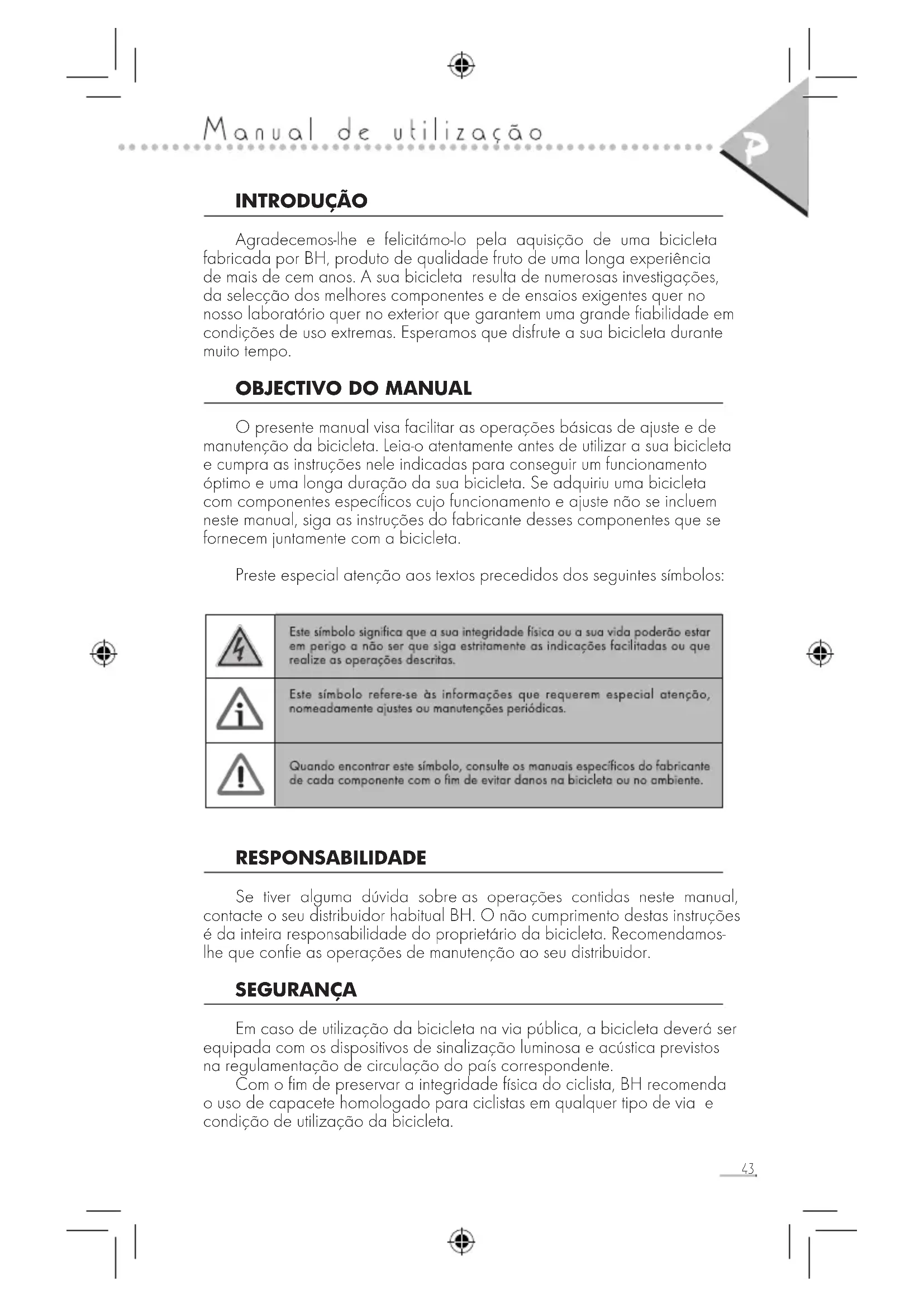 Agradecemos-lhe e felicitámo-lo pela aquisição de uma bicicleta fabricada por BH, produto de qualidade fruto de uma longa experiência de mais de cem anos. A sua bicicleta resulta de numerosas investigações, da selecção dos melhores componentes e de ensaios exigentes quer no nosso laboratório quer no exterior que garantem uma grande fiabilidade em condições de uso extremas. Esperamos que disfrute a sua bicicleta durante muito tempo.