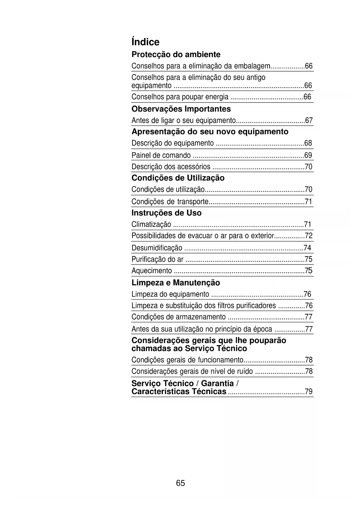 - Limpeza e substituição dos filtros purificadores p. 76