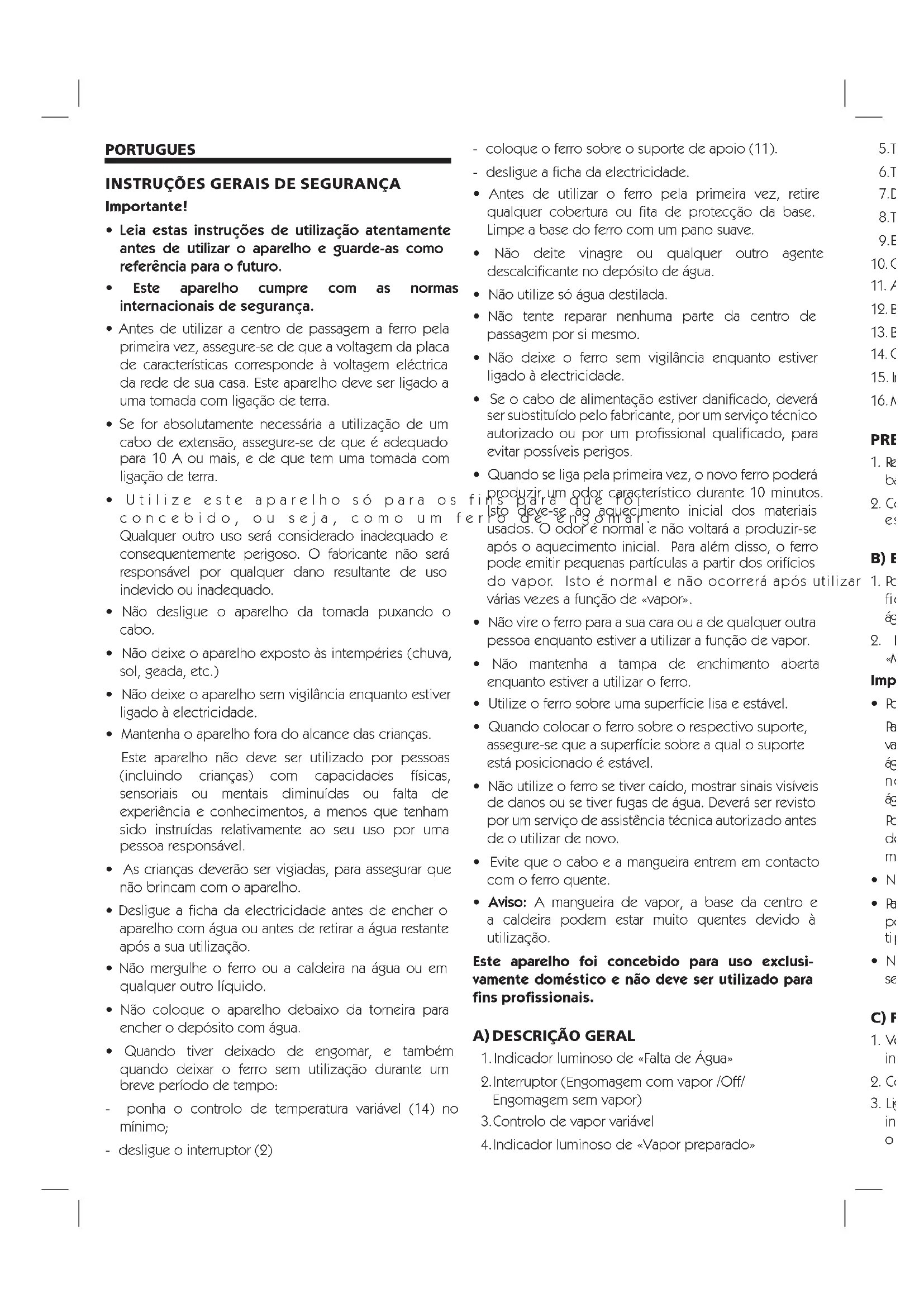 - Utilize este aparelho só para os fins para que foi concebido, ou seja, como um ferro de engomar. Qualquer outro uso será considerado inadequado e consequentemente perigoso. O fabricante não será responsável por qualquer dano resultante de uso indevido ou inadequado.