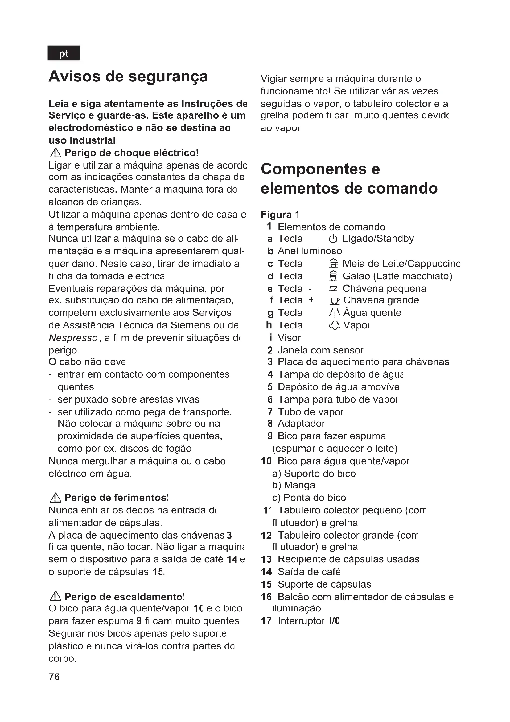 Perigo de choque eléctrico! Ligar e utilizar a máquina apenas de acordo com as indicações constantes da chapa de características. Manter a máquina fora do alcance de crianças. Utilizar a máquina apenas dentro de casa e à temperatura ambiente. Nunca utilizar a máquina se o cabo de ali- mentação e a máquina apresentarem qual- quer dano. Neste caso, tirar de imediato a fi cha da tomada eléctrica. Eventuais reparações da máquina, por ex. substituição do cabo de alimentação, competem exclusivamente aos Serviços de Assistência Técnica da Siemens ou de Nespresso , a fi m de prevenir situações de perigo. O cabo não deve - entrar em contacto com componentes quentes - ser puxado sobre arestas vivas - ser utilizado como pega de transporte. Não colocar a máquina sobre ou na proximidade de superfícies quentes, como por ex. discos de fogão. Nunca mergulhar a máquina ou o cabo eléctrico em água.